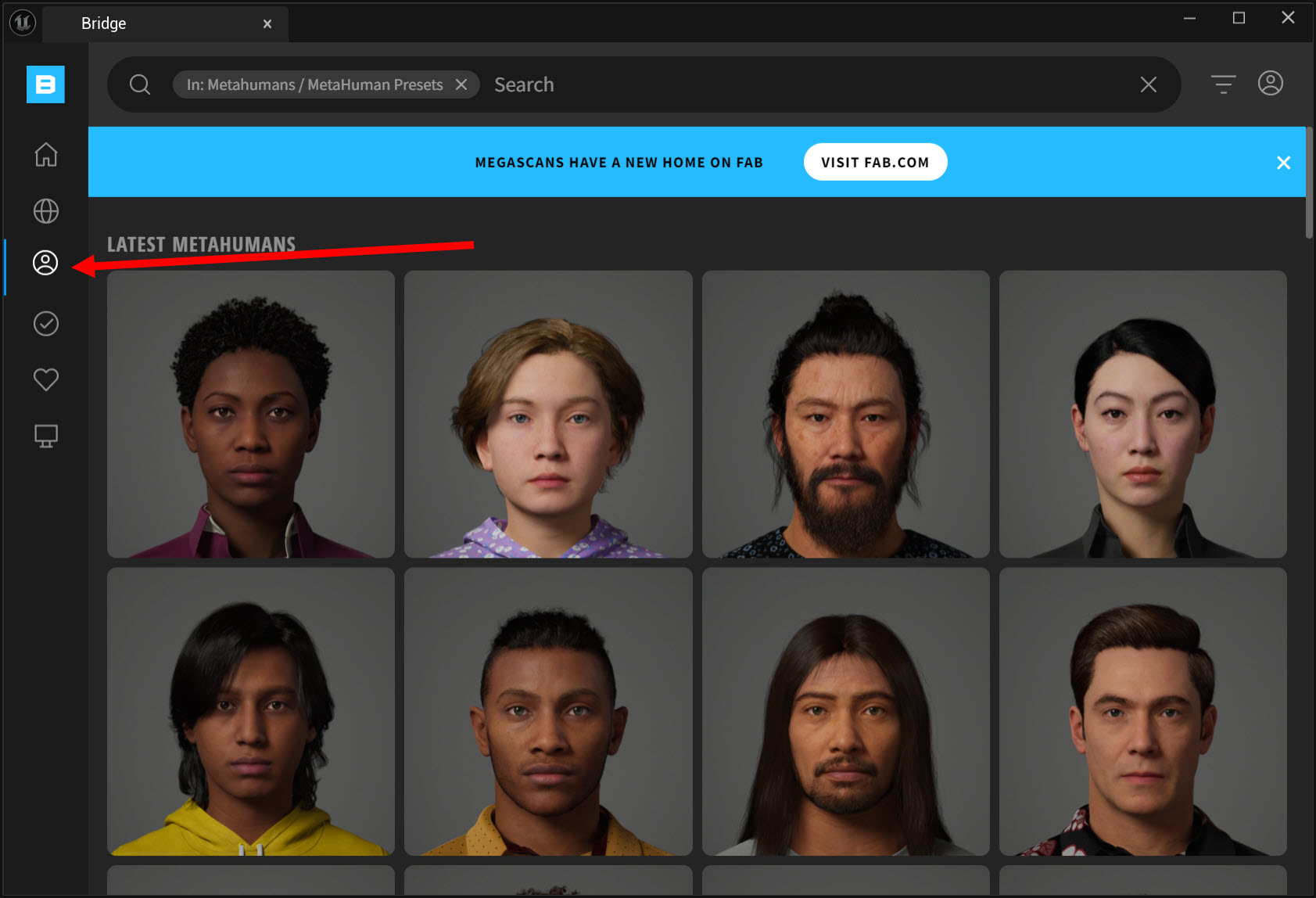 2)퀵셀 브릿지 좌측에서 메타 휴먼(Meta Human) 메뉴를 선택합니다.