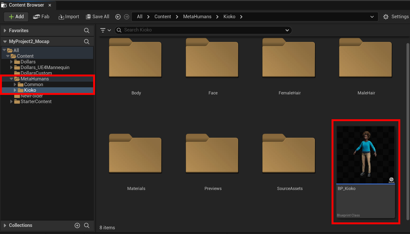 5)콘텐츠 브라우저에서 MetaHumans 폴더와 추가한 모델 및 메타휴먼 콘텐츠를 확인할수있습니다.
