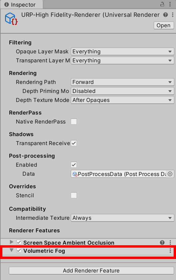 2)URP 렌더러에 volumetric fog 렌더러 기능(renderer features)을 추가합니다.