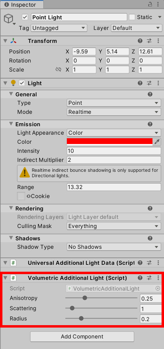 10)Spot, Point 조명 오브젝트에 Volumetric Additional Light 컴포넌트를 추가하고 속성을 설정합니다(anisotropy, scattering, radius)