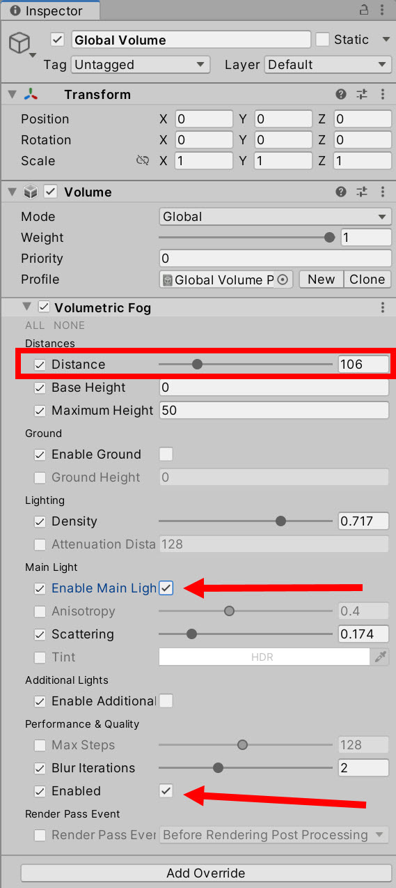 Volumetric Fog를 사용할 조명에 체크하고(Enable Main Light) 거리(Distance)를 설정합니다