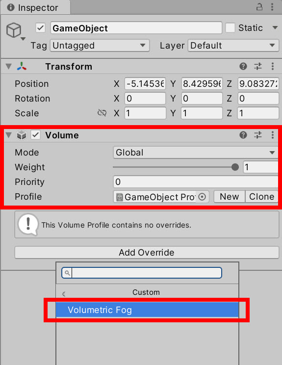 5)씬에 Volume을 생성하고 프로필에 Volumetric Fog를 추가합니다.