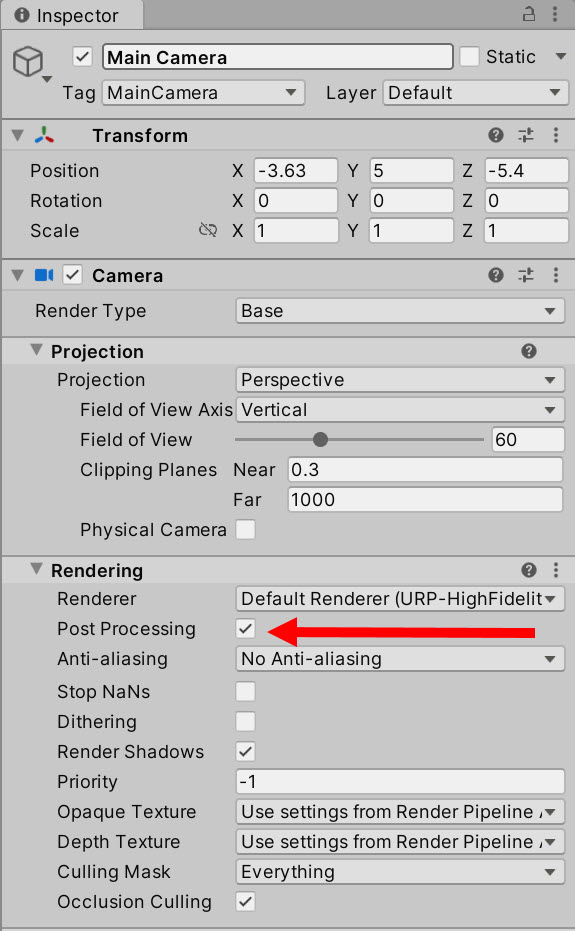 4)카메라 또는 URP 렌더러에서 Post Processing를 활성화합니다