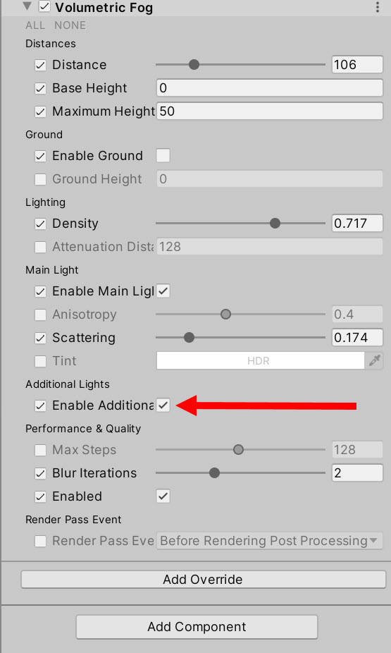 11)Volumetric Fog의 Enable Additional Light에 체크합니다.