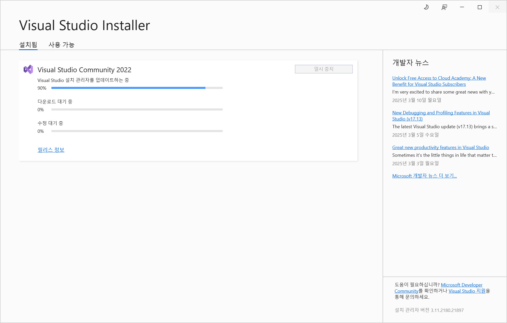 6)비주얼 스튜디오 설치 관리자 업데이트를 시작하며 다운로드 및 패키지 설치를 진행합니다.