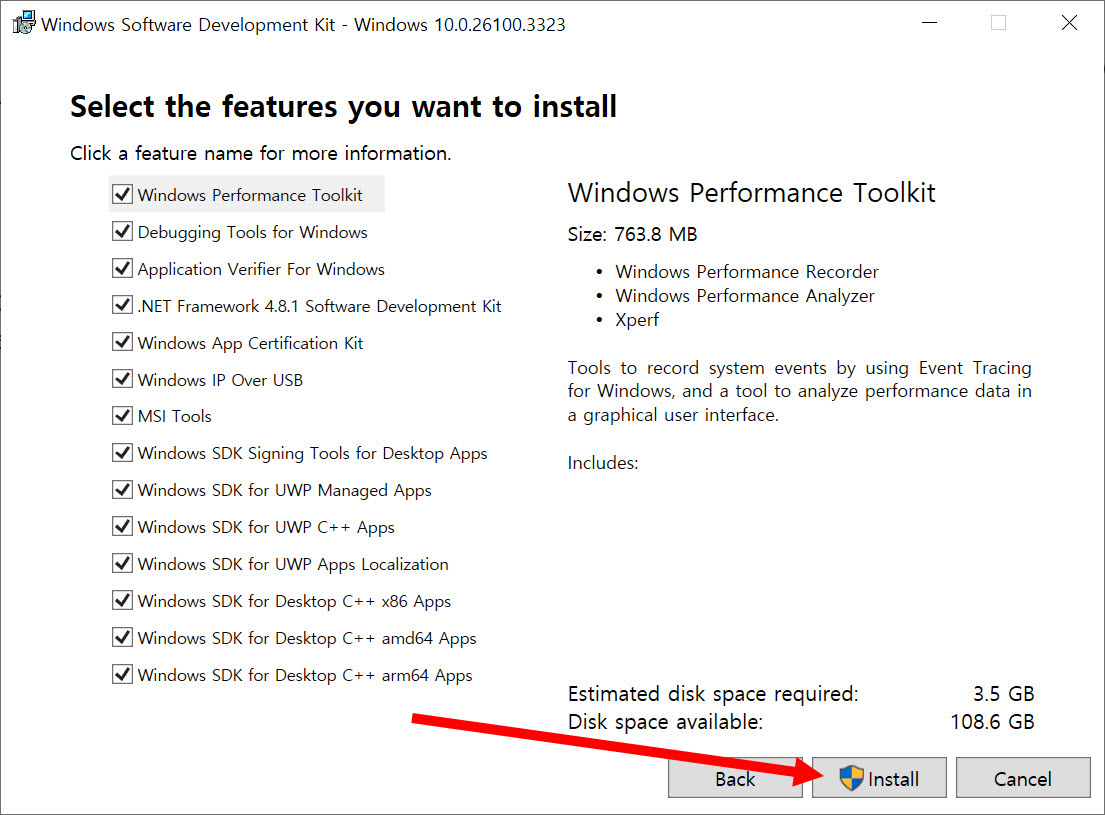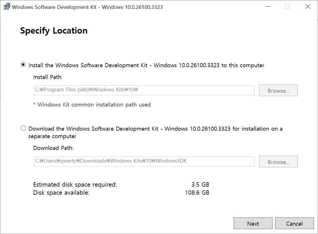 7)윈도우 SDK 설치 경로 및 옵션을 선택하고 설치를 진행합니다.
