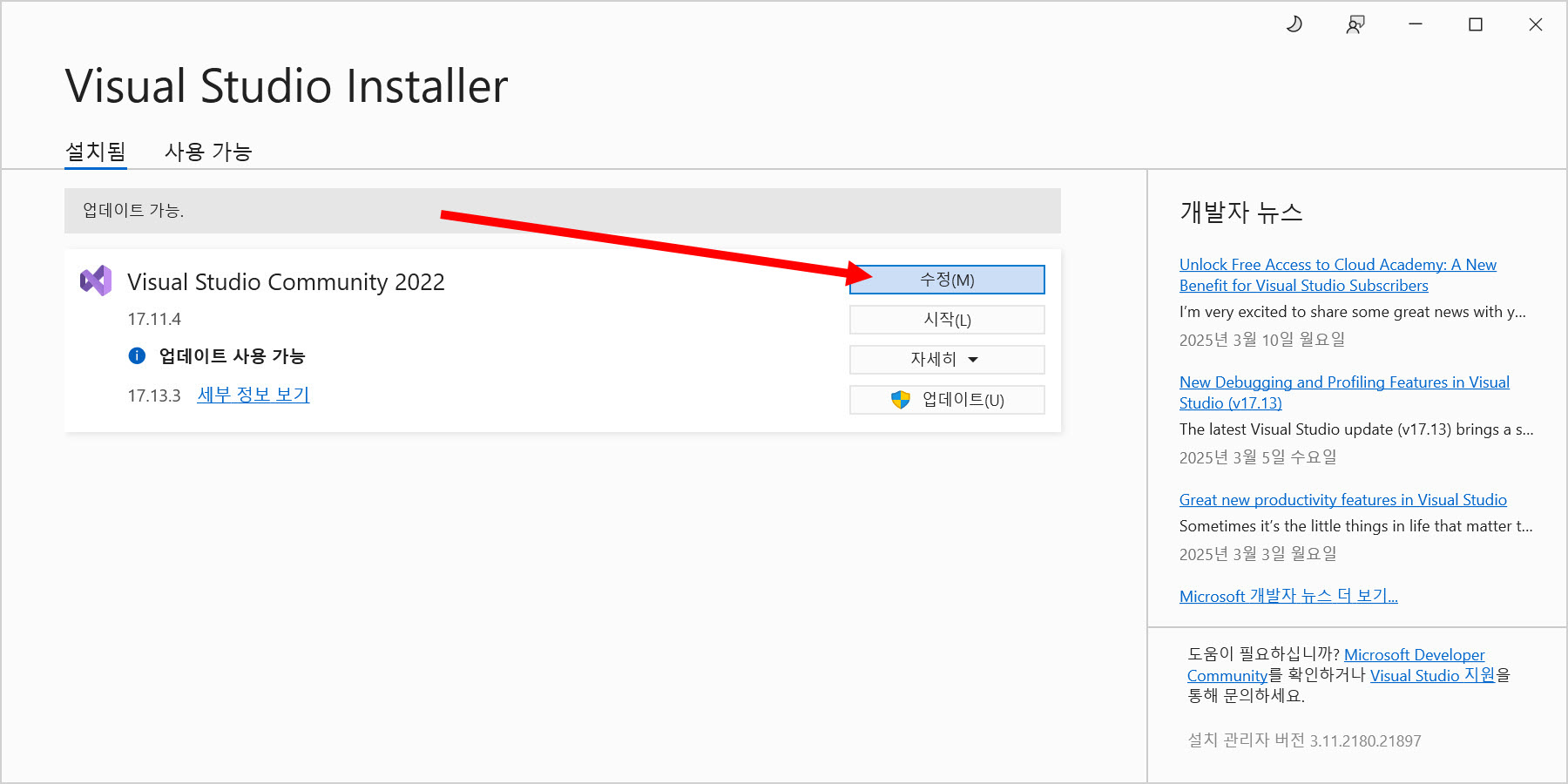 3)설치된 비주얼 스튜디오의 수정으로 이동합니다.