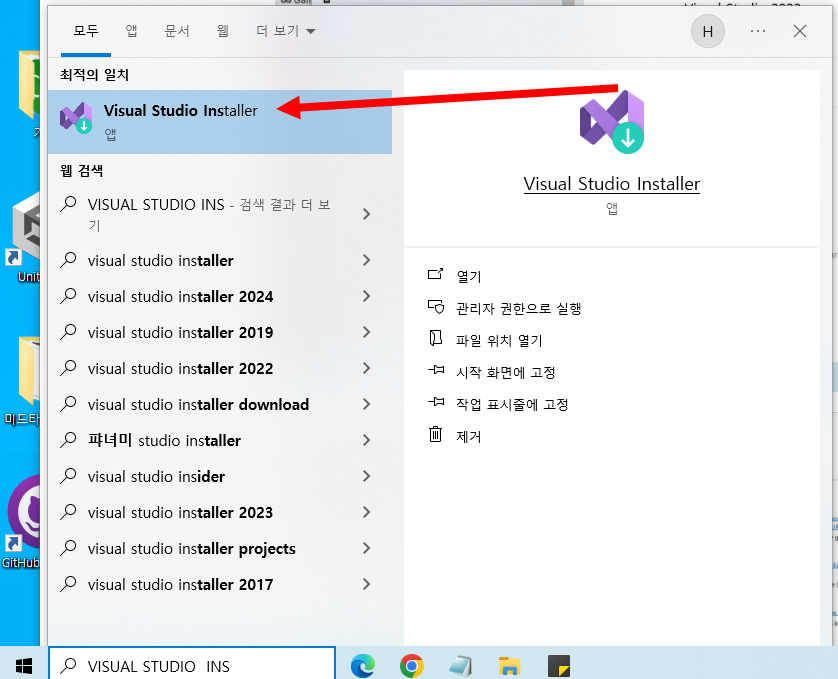 2)Visual Studio Installer를 검색 및 실행합니다.