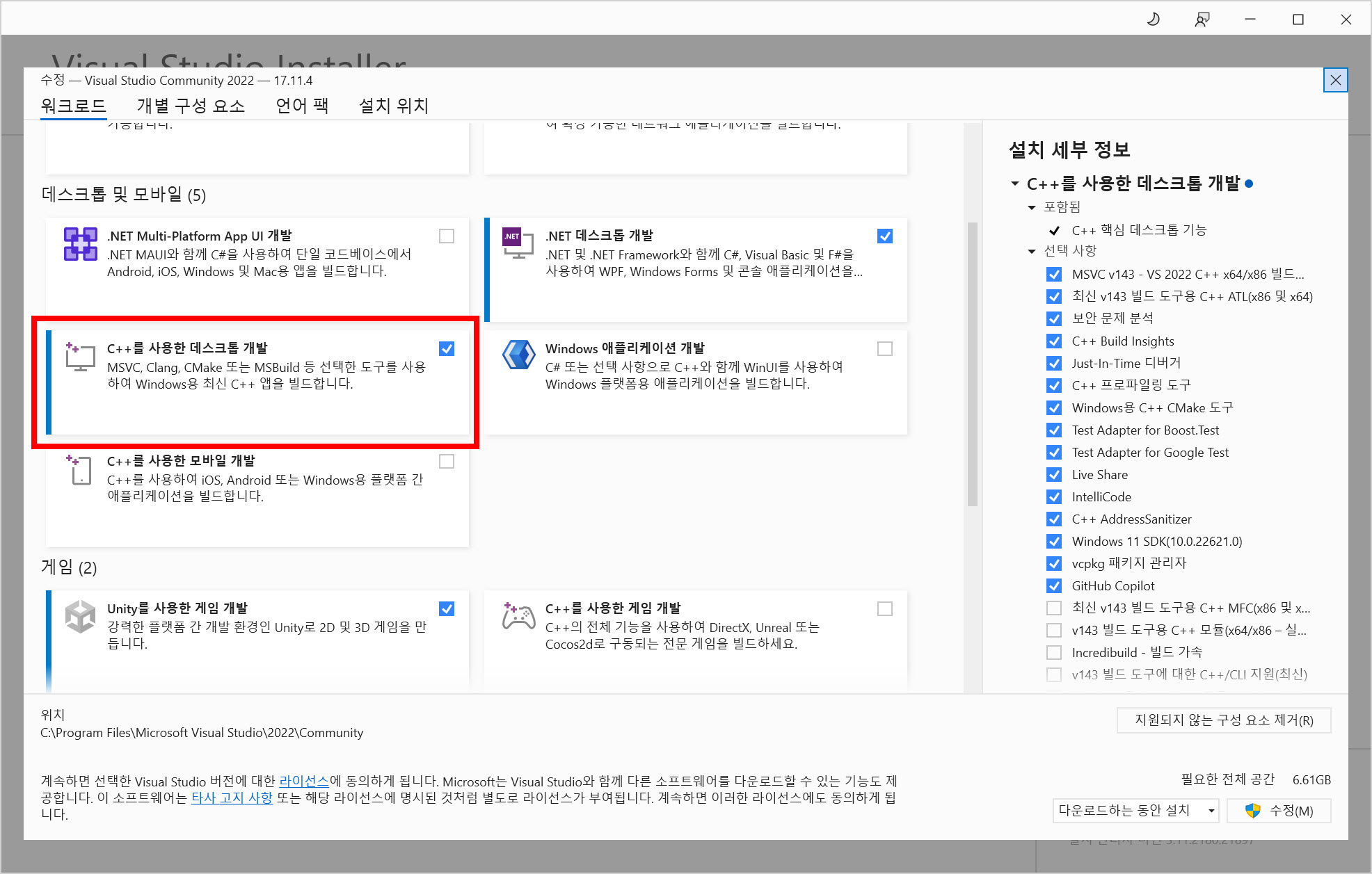 5)c++를 사용한 데스크톱 개발에 체크하고 수정으로 이동합니다.