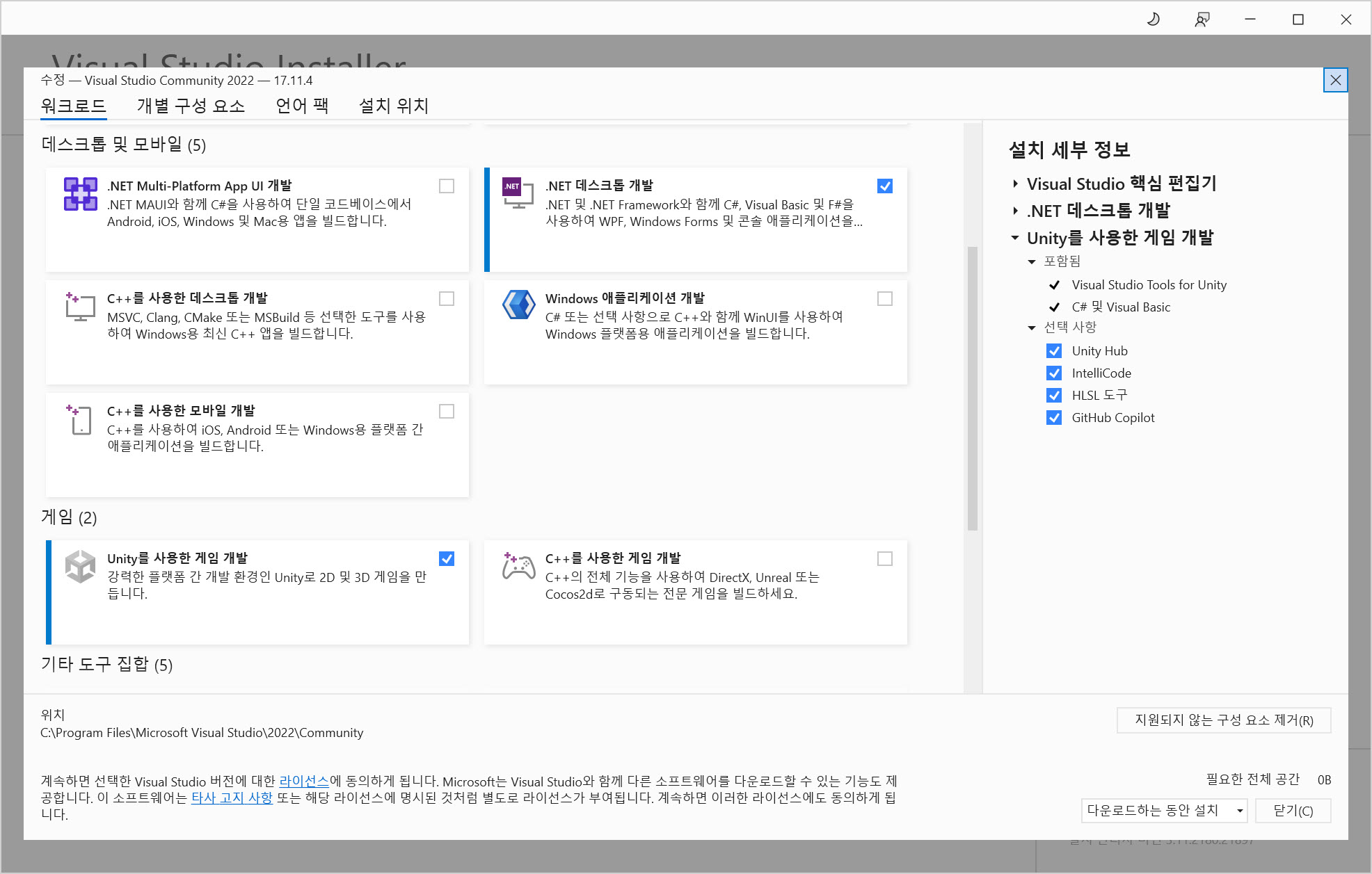 4)현재 비주얼 스튜디오 설치에 포함된 세부 정보를 확인할수있습니다.