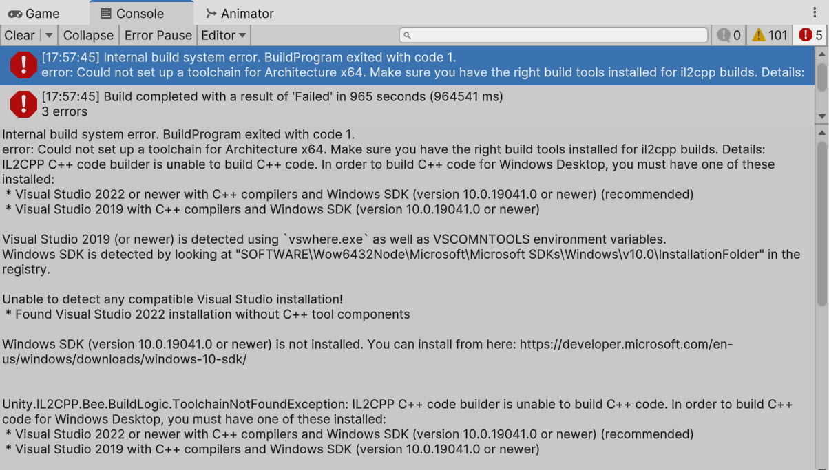 error: Could not set up a toolchain for Architecture x64. Make sure you have the right build tools installed for il2cpp builds. Details: IL2CPP C++ code builder is unable to build C++ code. in order to build C++ code for windows desktop, you must have one of these installed: