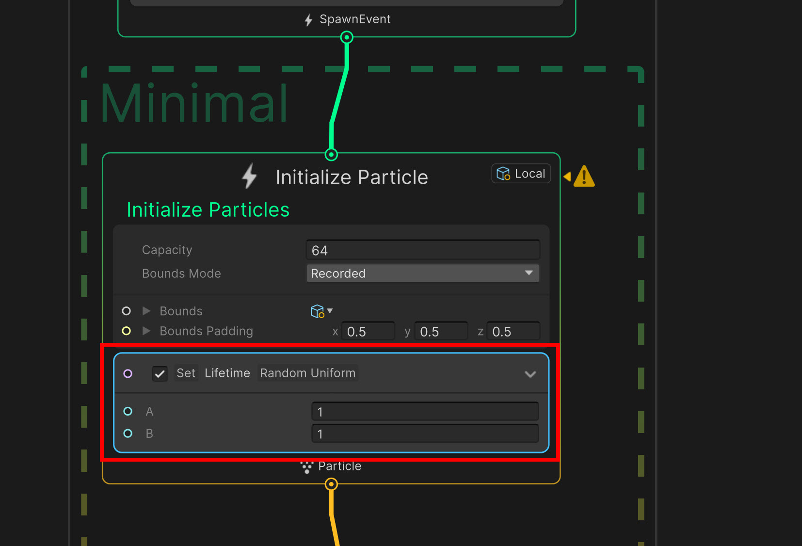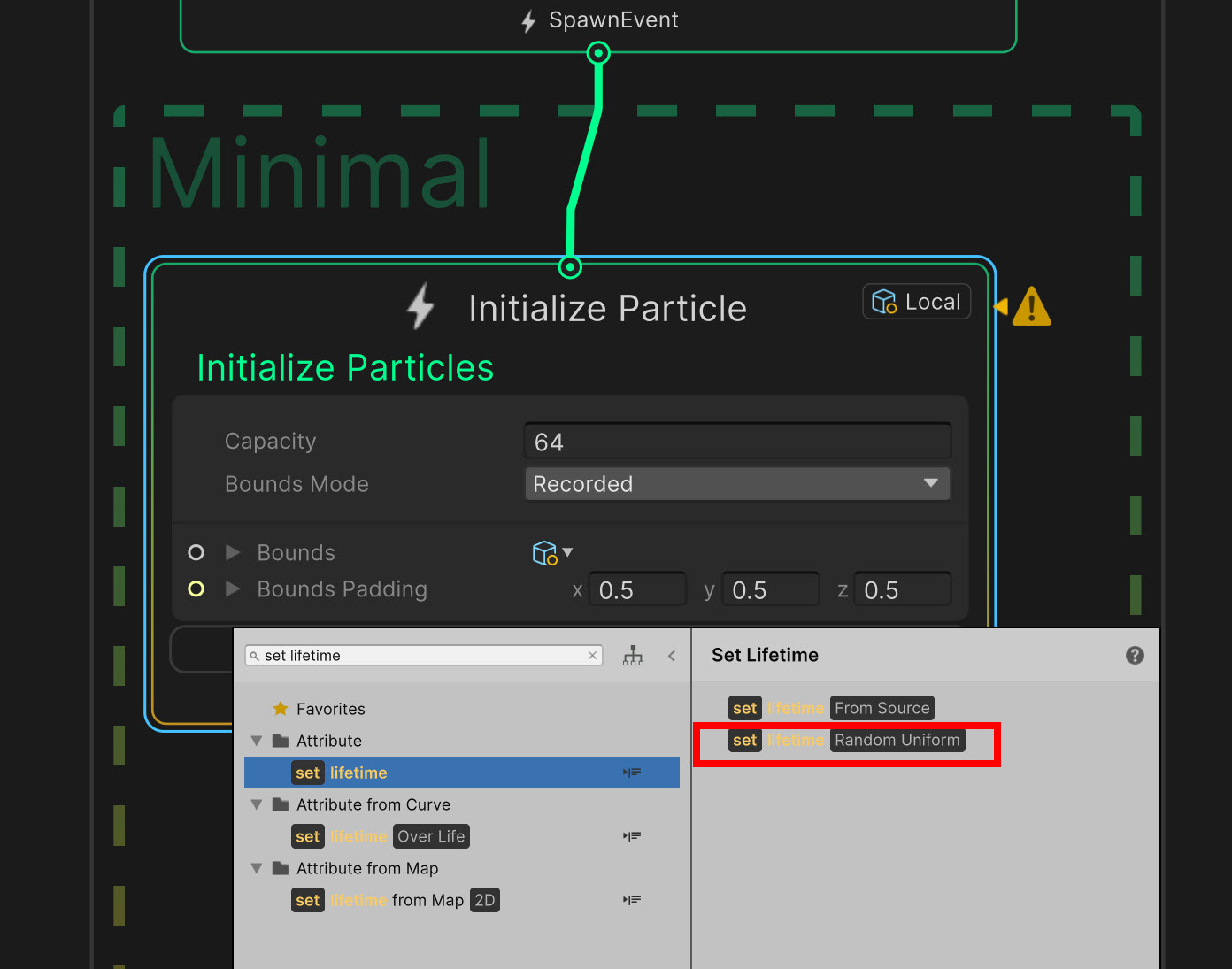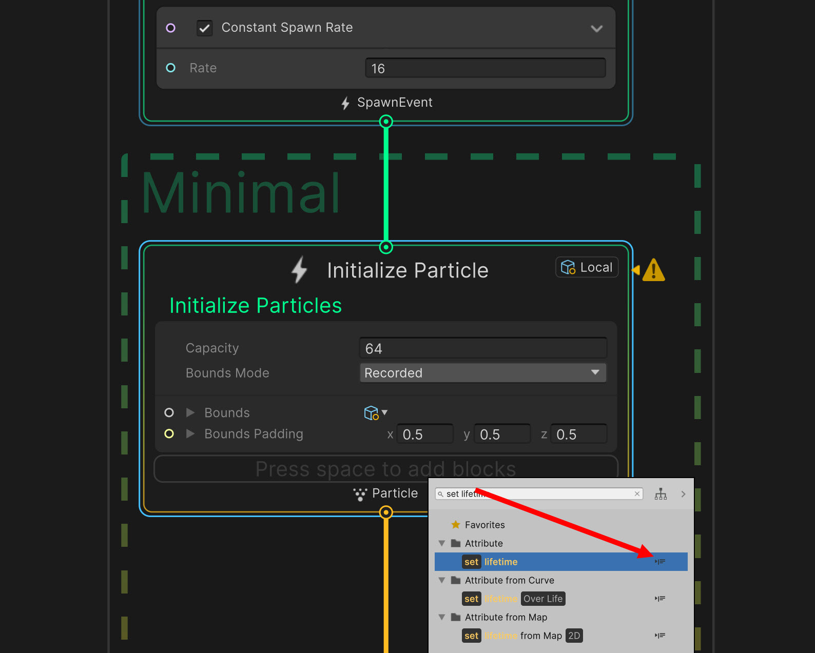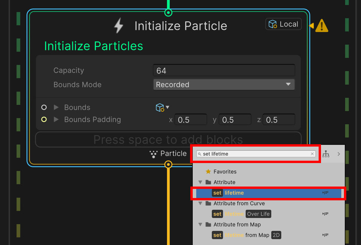 1)비주얼 이펙트 그래프에서 파티클의 노드 블록을 추가합니다. 블록 추가에서 추가할 속성을 검색합니다(set lifetime)