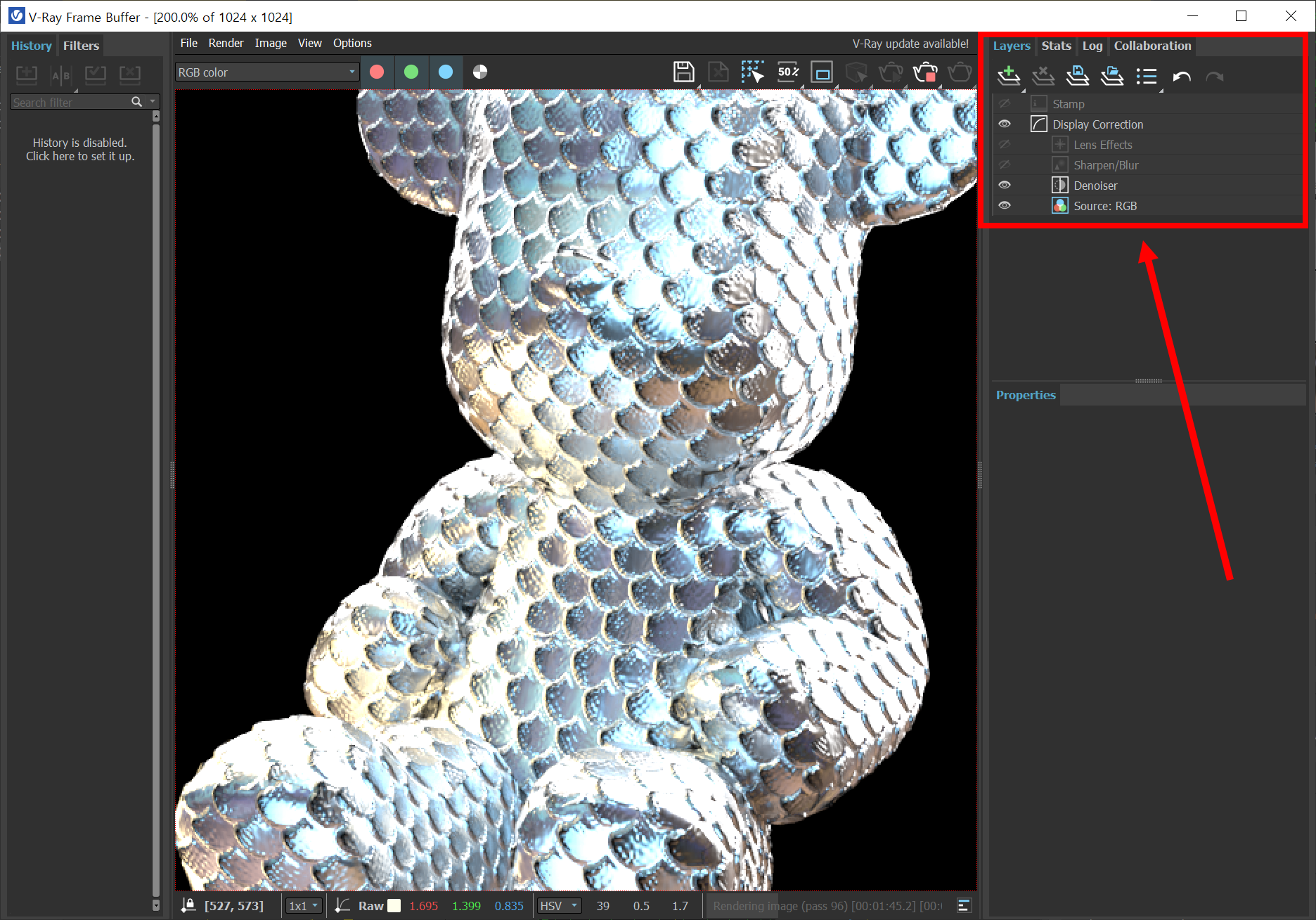 2)우측 상단의 Layers 패널에서 렌더링된 이미지를 조정하기 위한 다양한 기능 레이어를 제공합니다.