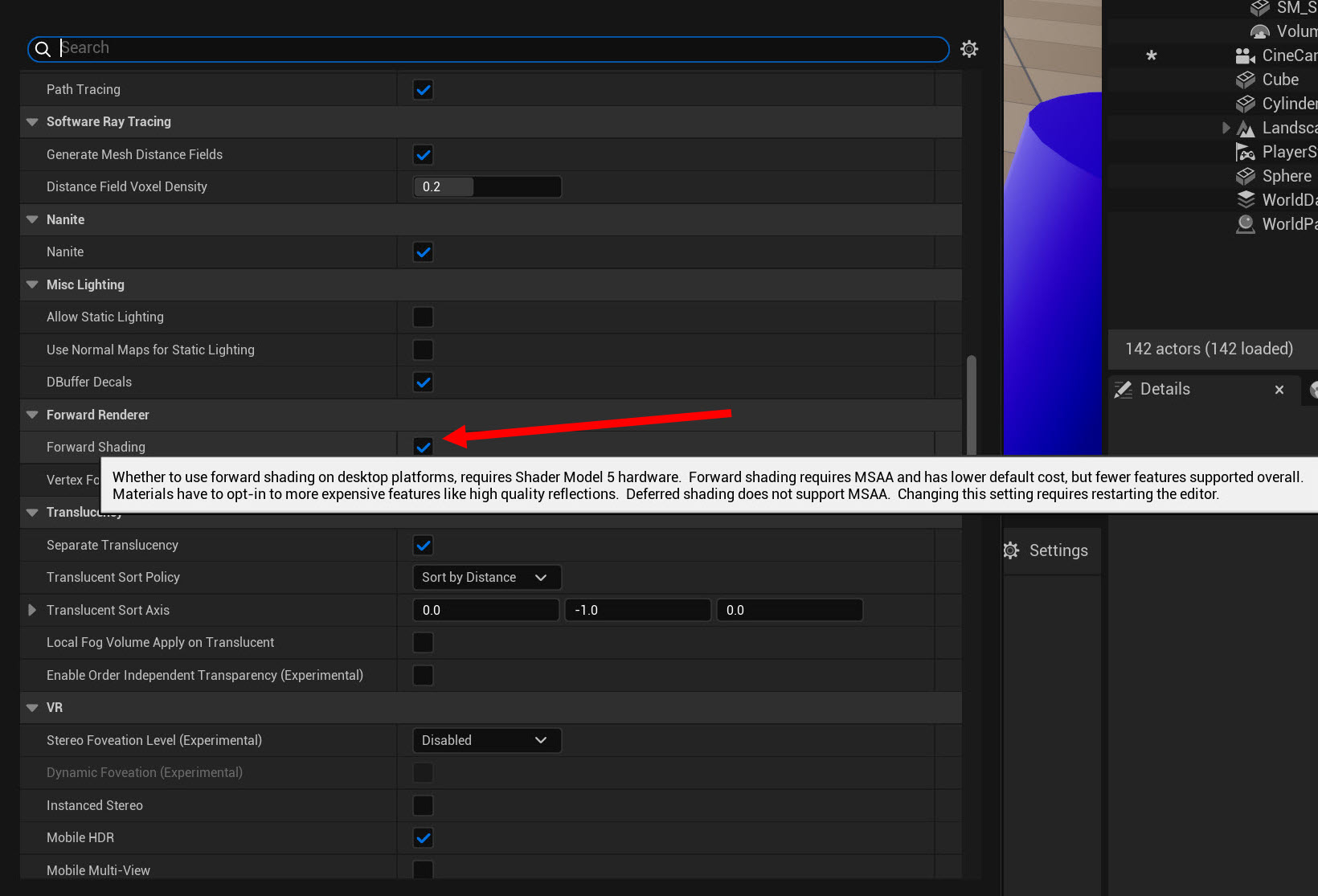 언리얼 엔진(Unreal Engine)에서 포워드 렌더러(Forward Renderer) 지원 활성화