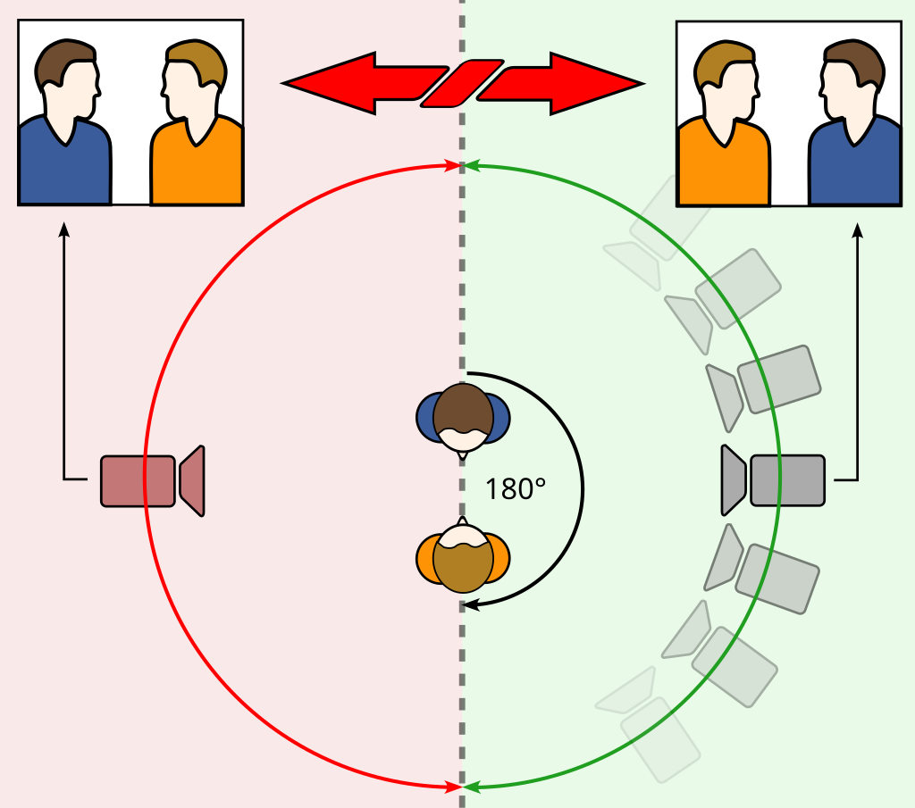 만약 카메라가 180도를 넘어서 반대편에서 촬영하게 되면 관객은 두 사람의 위치가 바뀌었다고 혼동할 수 있습니다. 예외적인 경우에 영화 감독은 긴장감 또는 혼란을 일으키기 위해 의도적으로 행동 라인을 끊습니다.