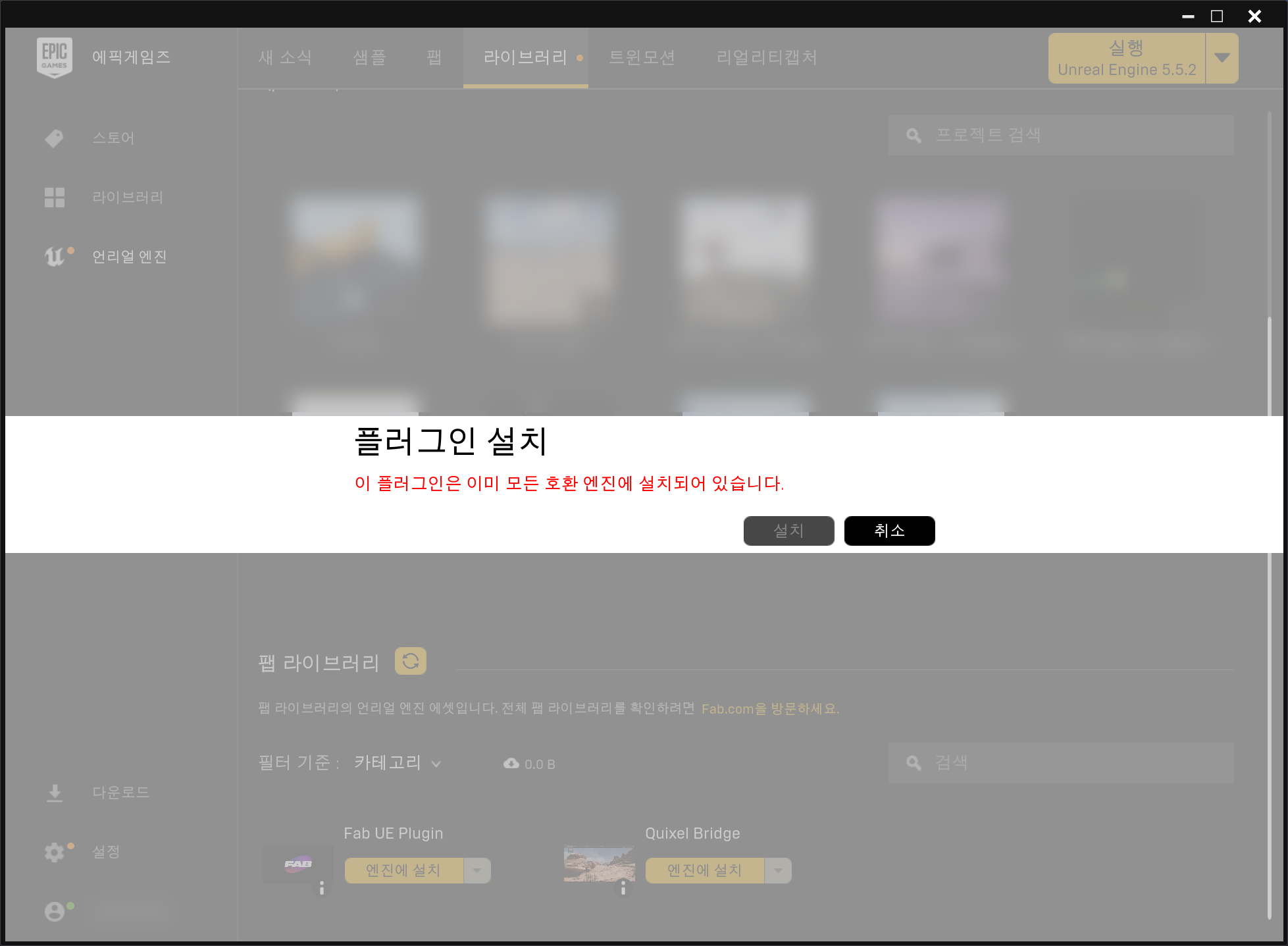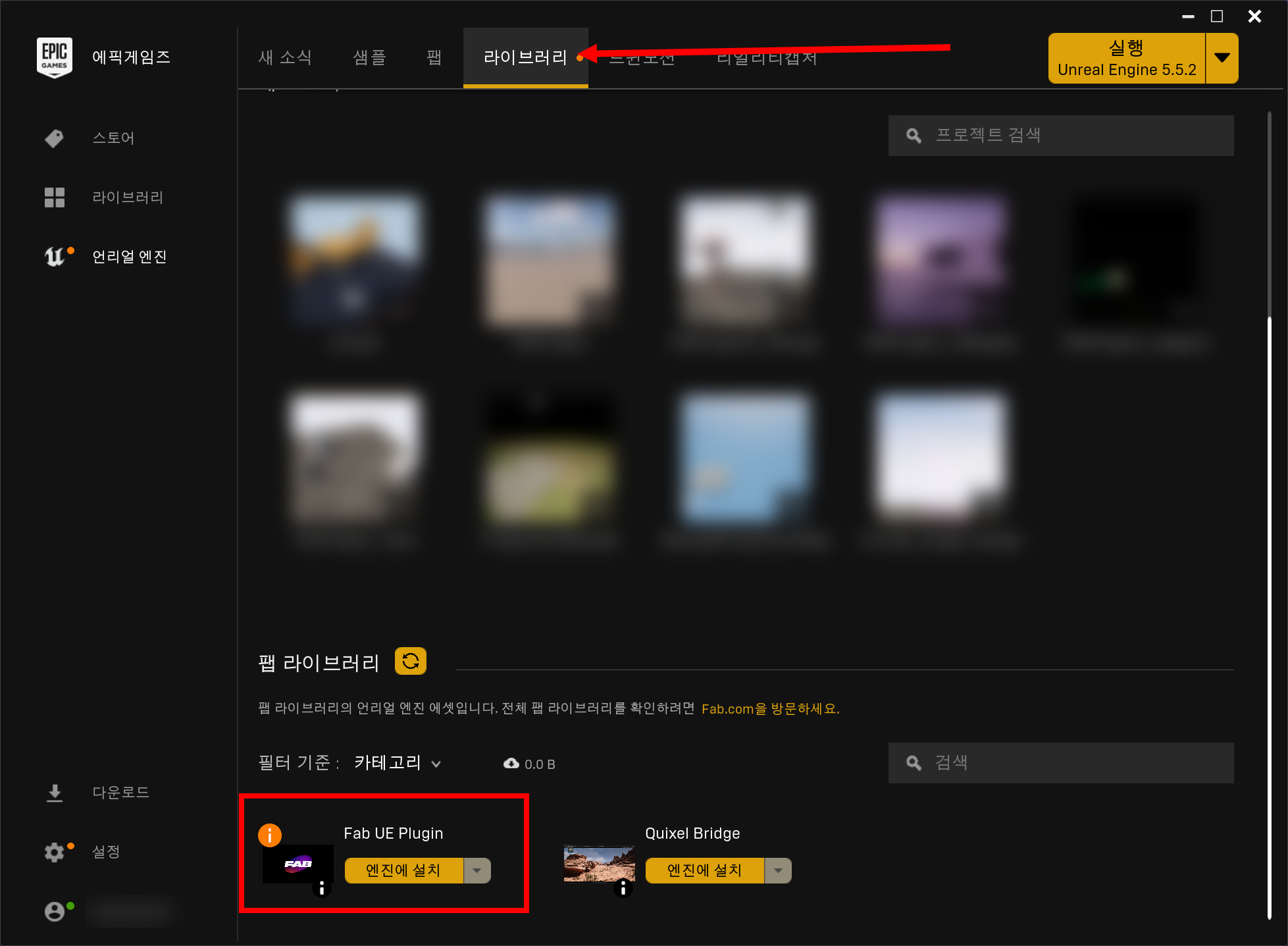 1)에픽 게임즈 런처 앱 상단의 라이브러리를 선택하고 팹 라이브러리에서 Fab UE Plugin(팹 언리얼 엔진 플러그인) 설치를 진행합니다.