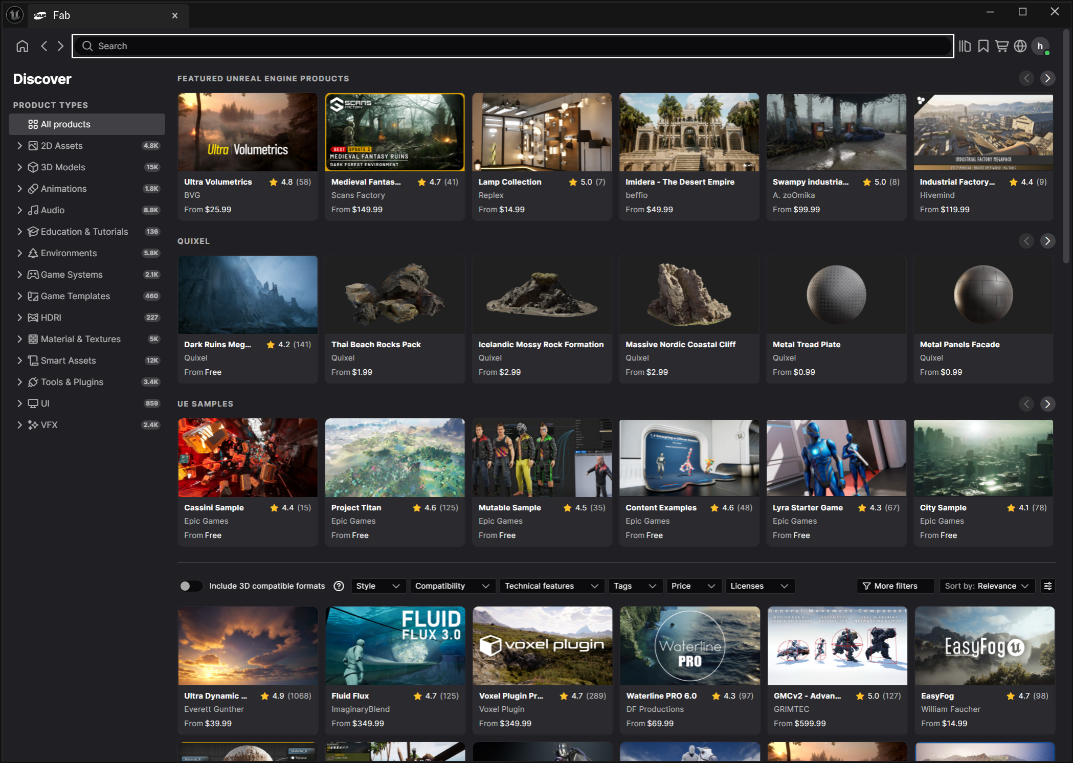 10)Fab 플러그인을 열기하며 Fab에서 이용가능한 모든 에셋을 표시합니다.