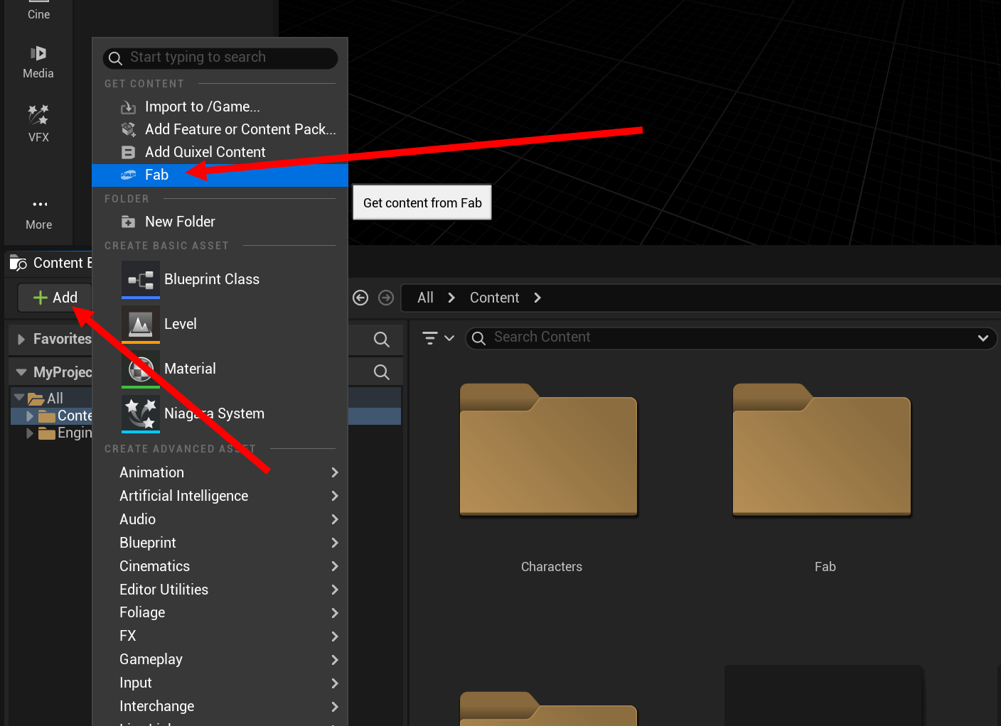 9)콘텐츠 브라우저에서 add를 클릭하고 Fab으로 이동합니다.