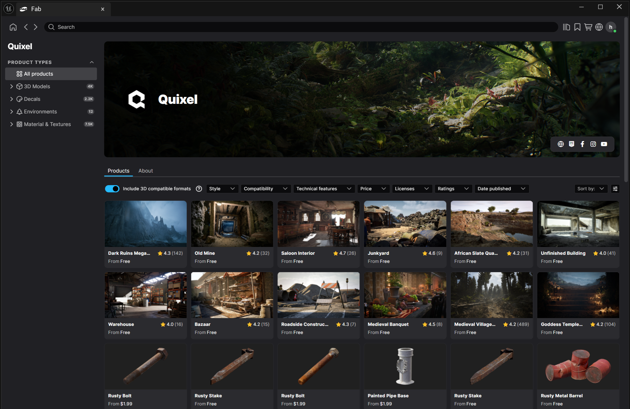 12)퀵셀에서 제공하는 에셋을 확인하고 제공자 퀵셀(Quixel) 페이지로 이동합니다.