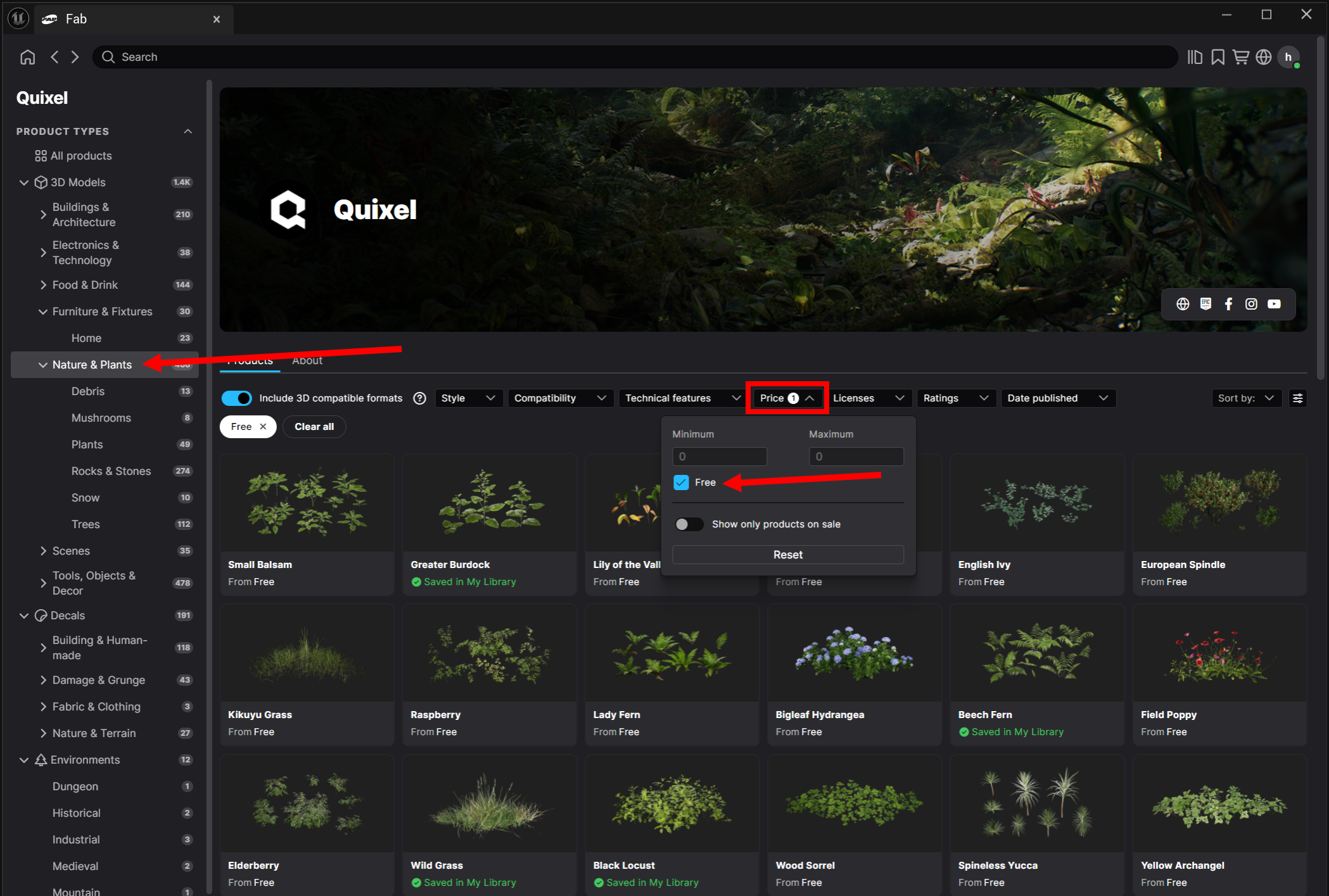 14)카테고리에서 에셋 유형을 선택하고 필터링 옵션을 선택합니다. 무료 제공 에셋만 표시하려면 price에서 free에 체크합니다.