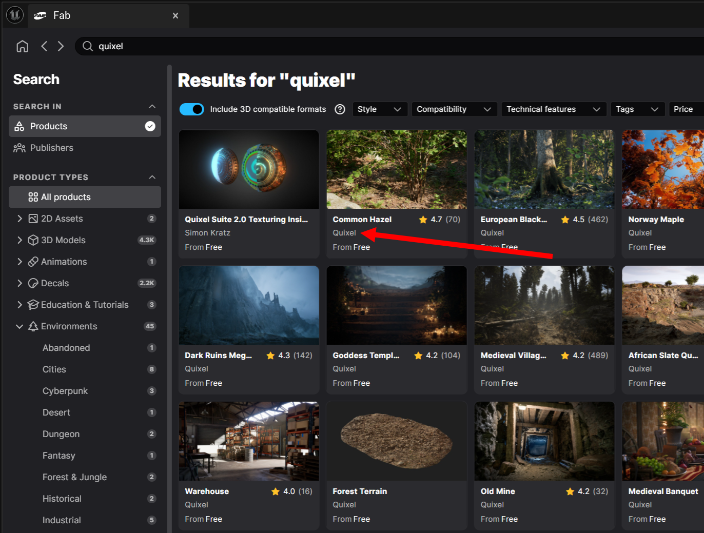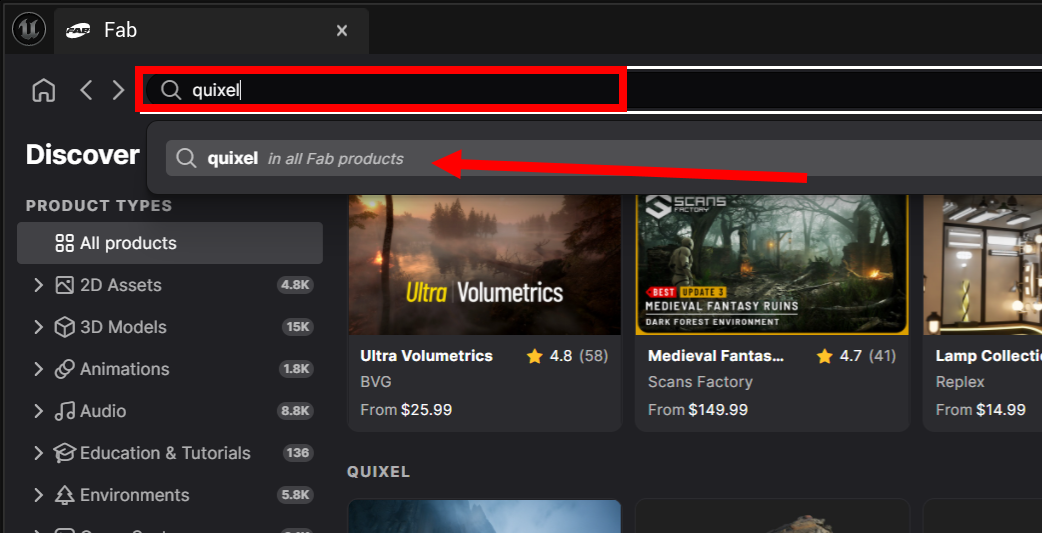 11)Fab 플러그인의 상단에서 퀵셀(quixel)을 검색합니다.