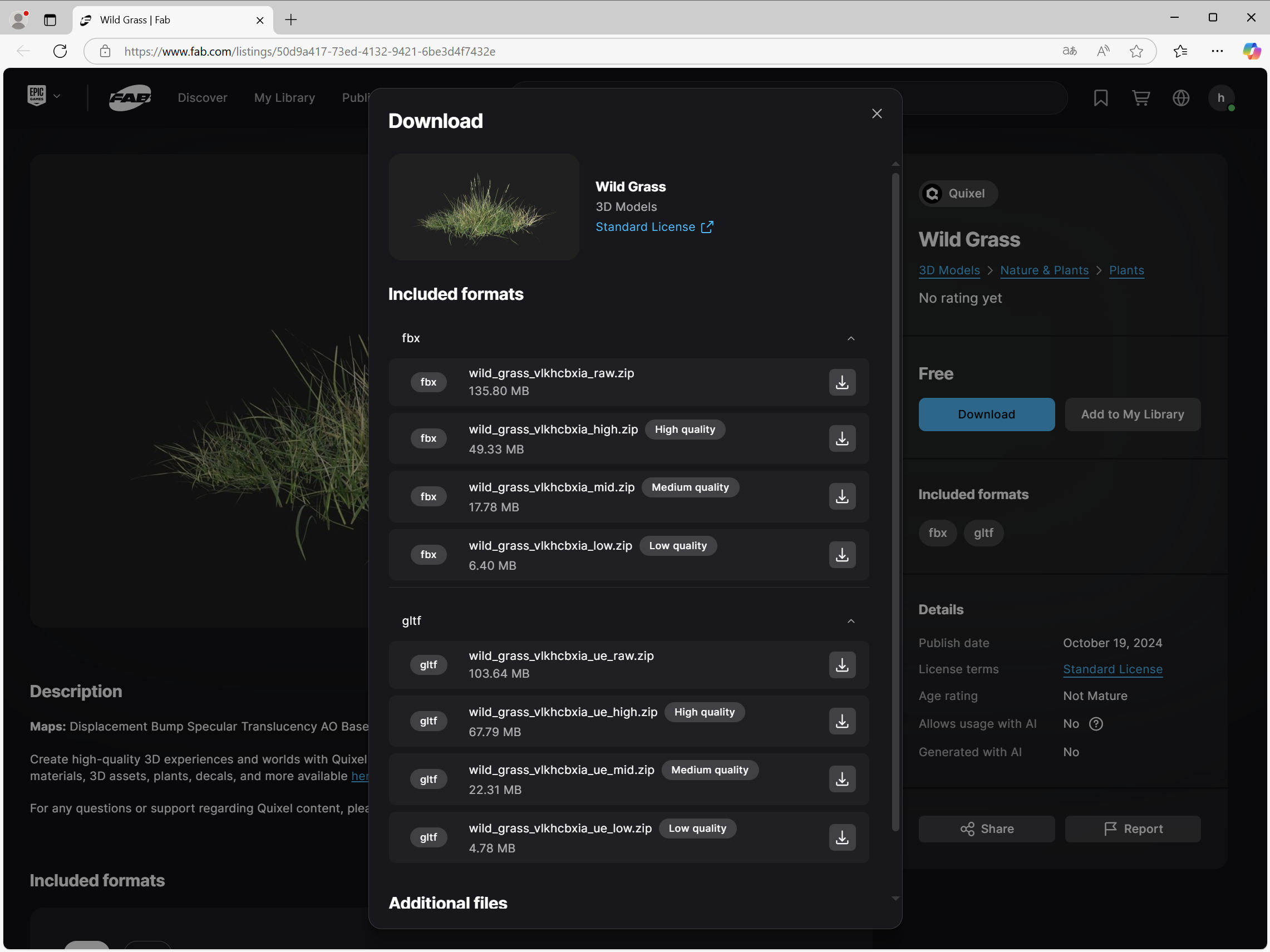 Quixel Content에서 다운로드한 3D 에셋은 FBX, gltf등의 포맷으로 제공되며 언리얼 엔진의 콘텐츠 브라우저에 수동으로 추가하여 사용할수있습니다.