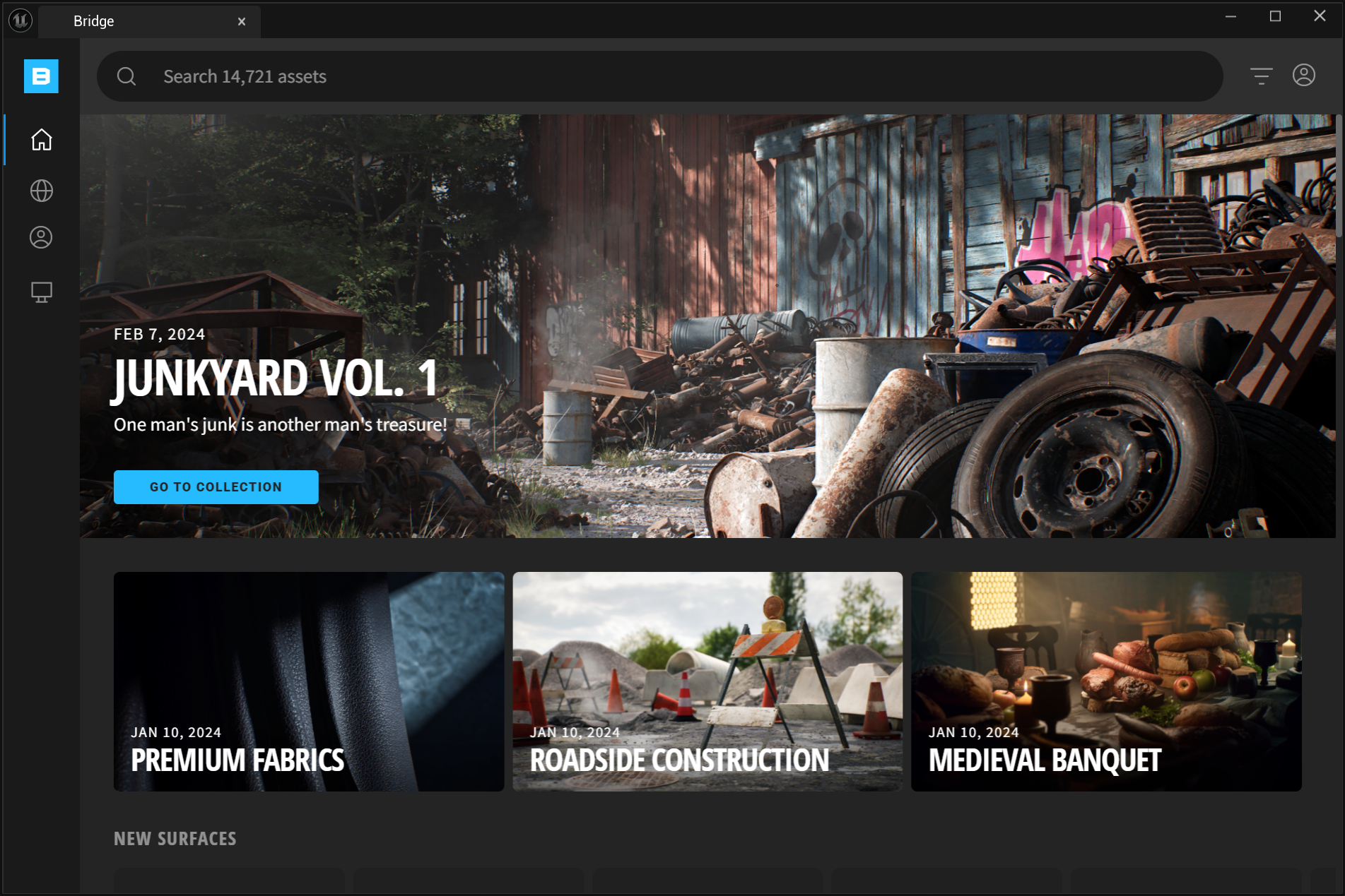 5)quixel content 좌측 홈(Home) 또는 콜렉션(Collection) 메뉴에서 퀵셀(quixel)에서 제공하는 메가스캔 에셋을 확인할수있습니다.