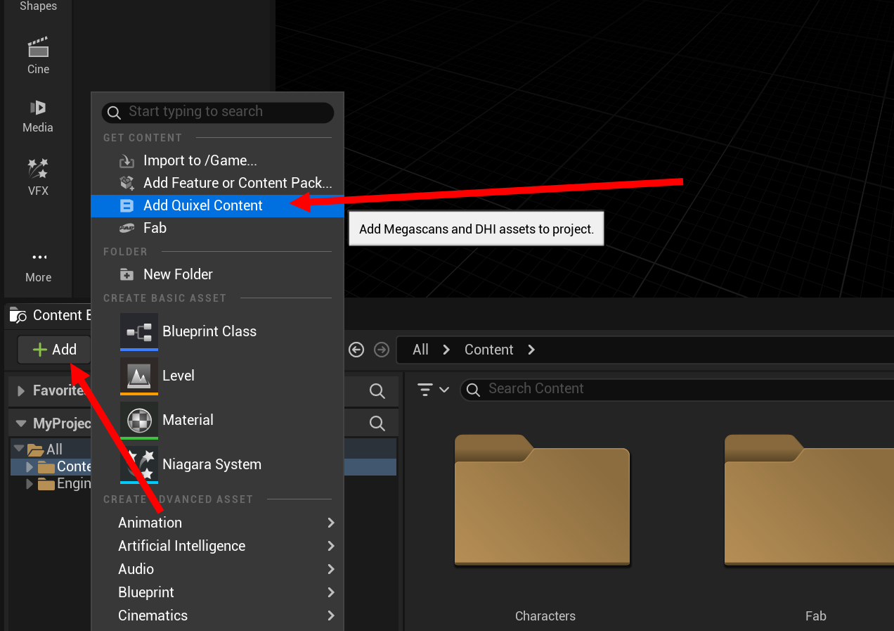 3)언리얼 엔진의 콘텐츠 브라우저에서 add를 클릭하고 add quixel content로 이동합니다.