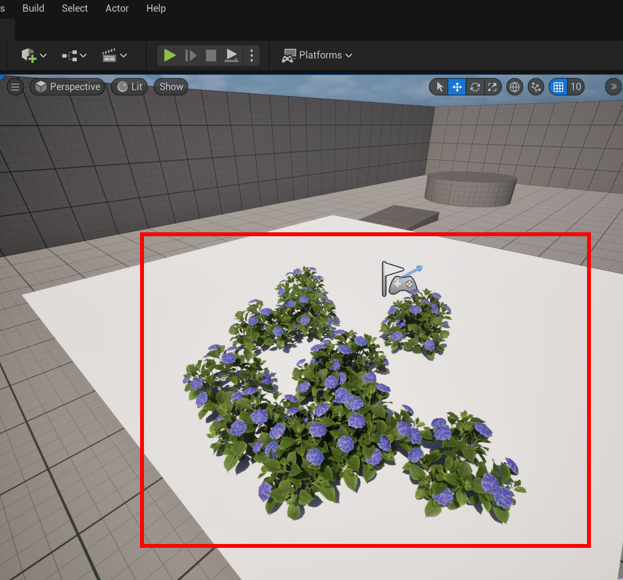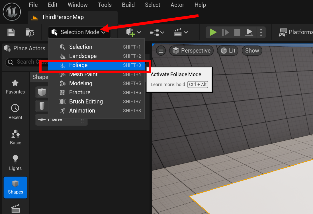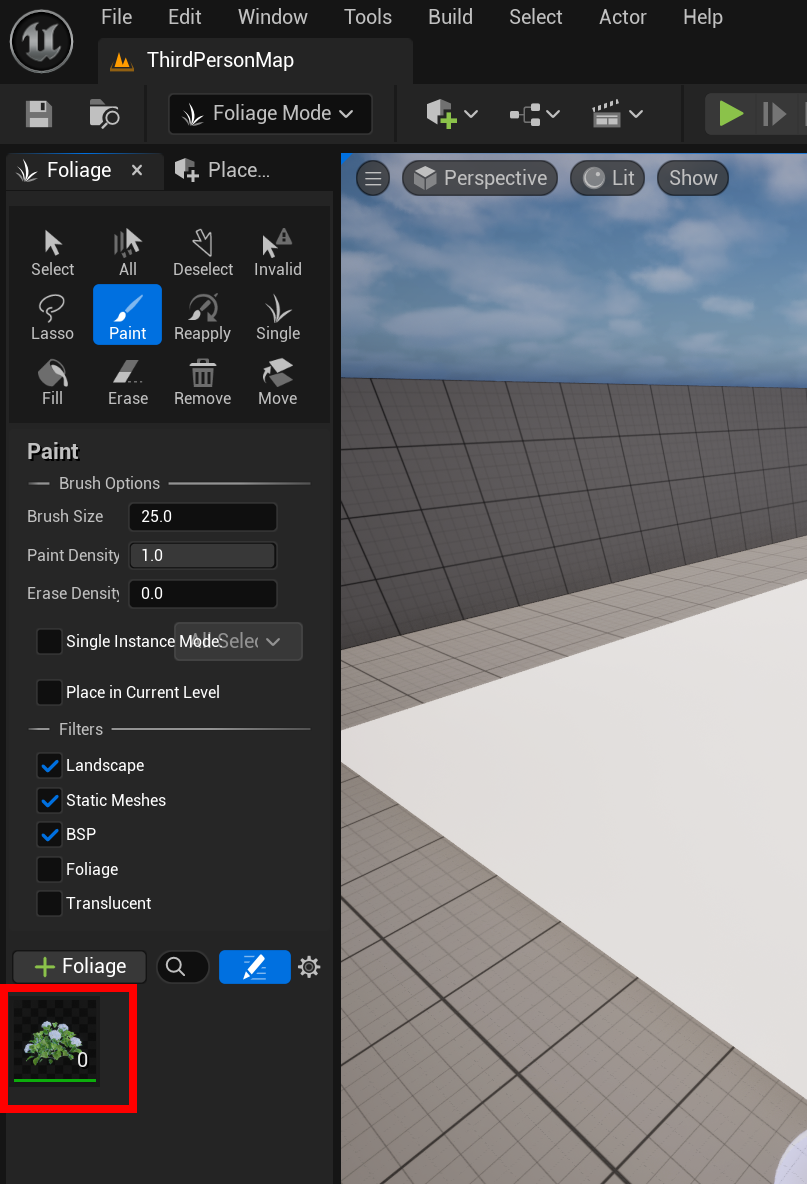 1)레벨에서 폴리지(foliage)를 추가할 지오메트리를 준비합니다(Plane)