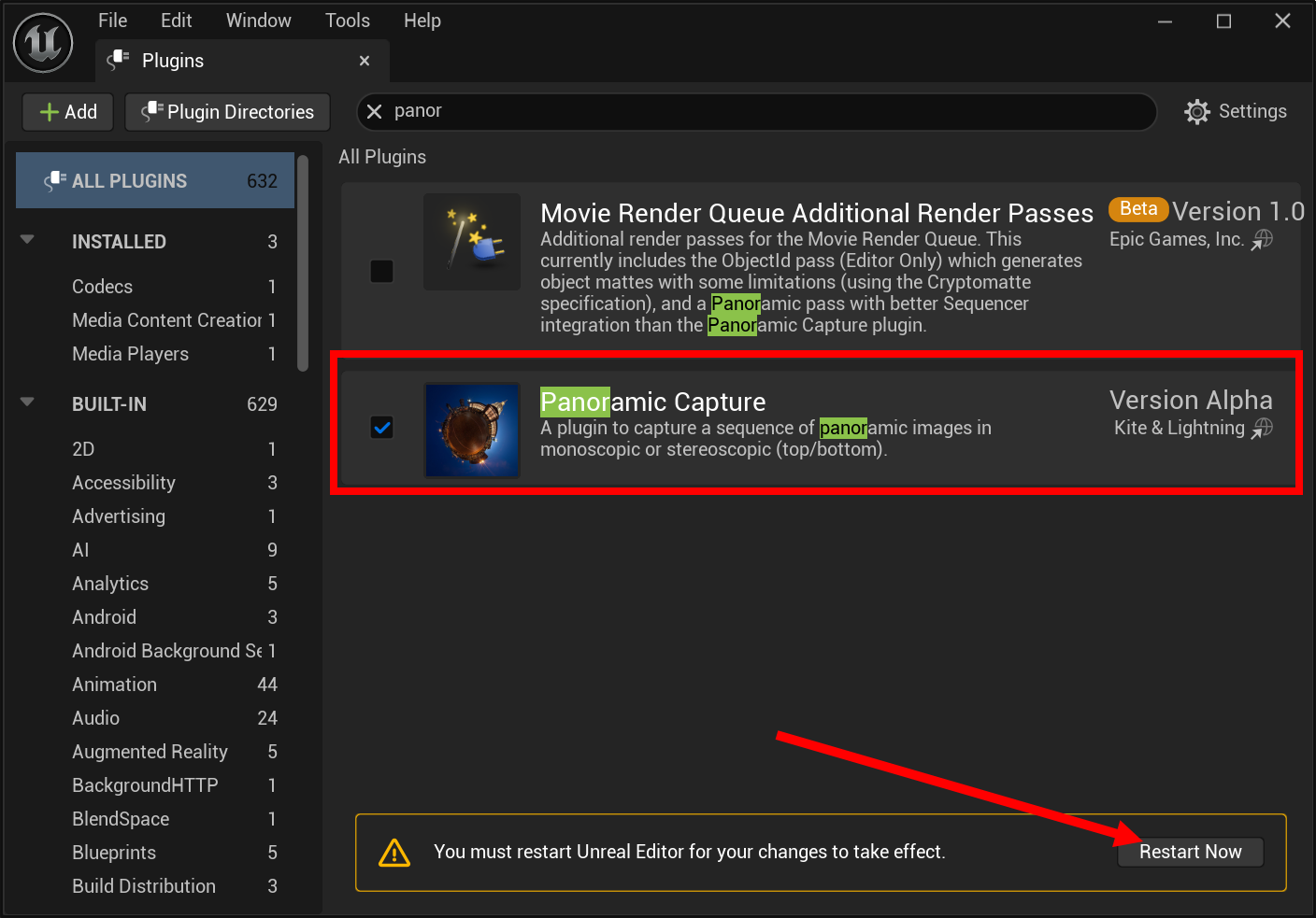 1)언리얼 엔진 플러그인(Plugins)에서 Panoramic Capture 플러그인을 선택 및 에디터를 재실행합니다.