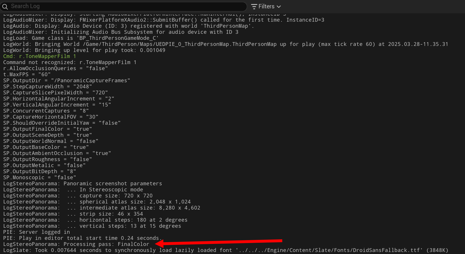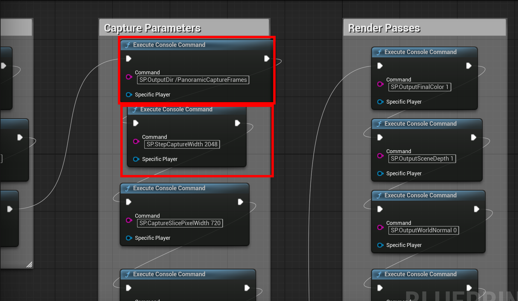 6)Capture Parameters에서 이미지 저장 경로(예를들어 /PanoramicCaptureFrames) 및 이미지 가로 해상도를 설정합니다(SP.OutputDir, SP.StepCaptureWidth)