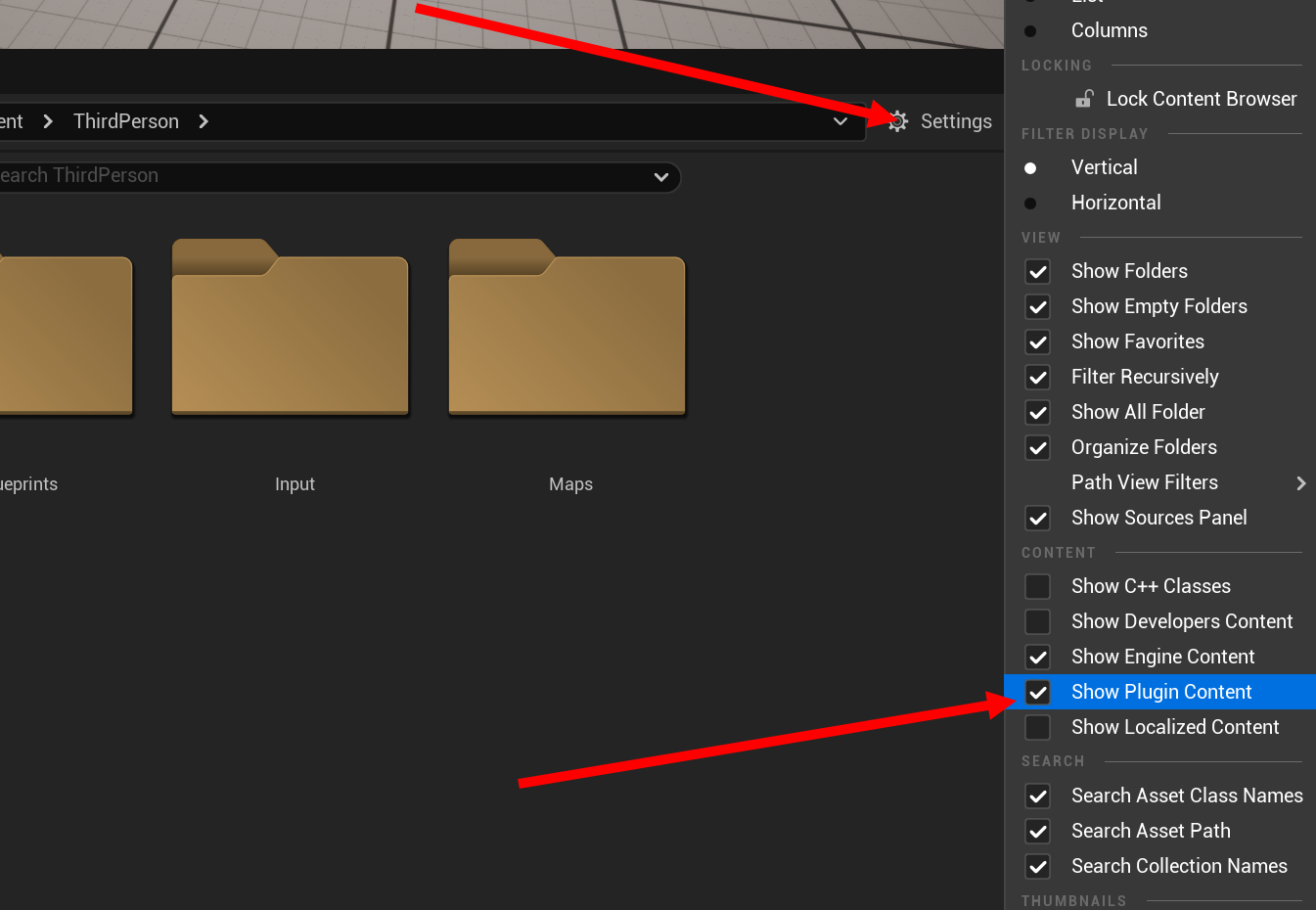 2)콘텐츠 브라우저에서 플러그인 콘텐츠 보기 옵션에 체크합니다(Show Plugin Content)