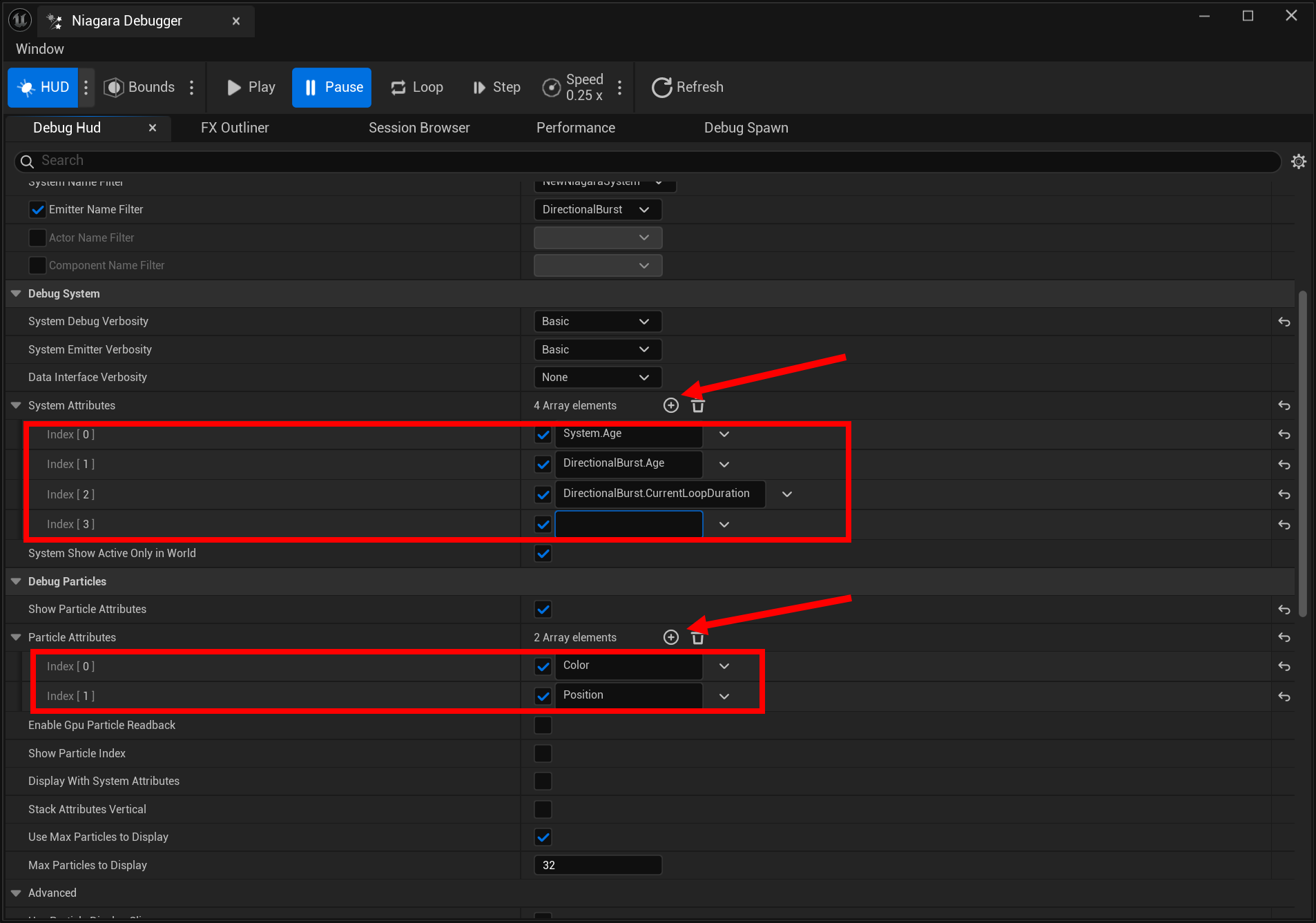 7)나이아가라 디버거에서 정보를 표시할 시스템 및 파티클 속성을 추가합니다(system attributes, particle attributes)
