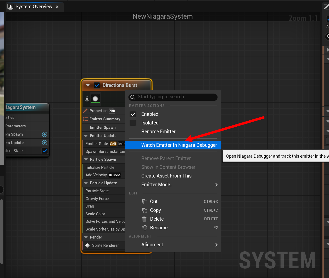 2)또는 나이아가라 시스템 편집기에서 에미터(emitter)를 선택 마우스 우클릭한후 watch emitter in niagara debugger를 선택합니다.