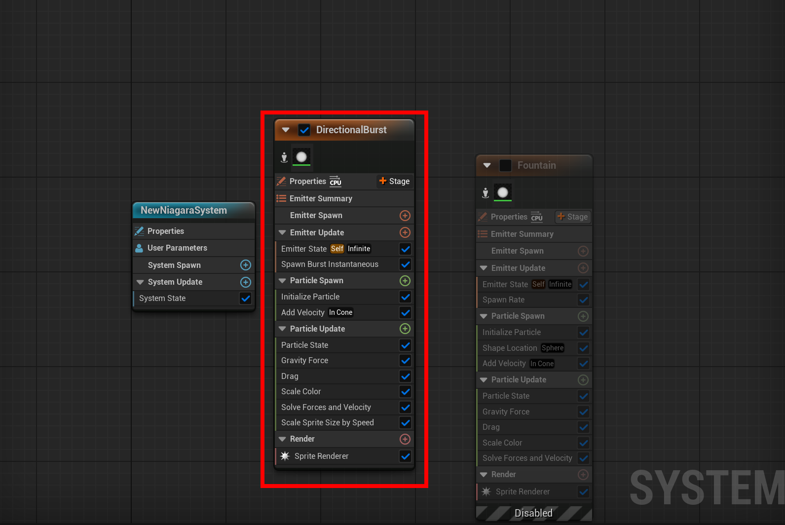 6)나이아가라 시스템 편집기의 파라미터(parameters)에서 시스템, 에미터, 파티클 속성을 확인합니다.