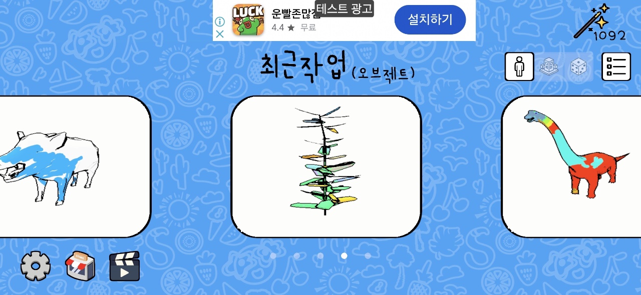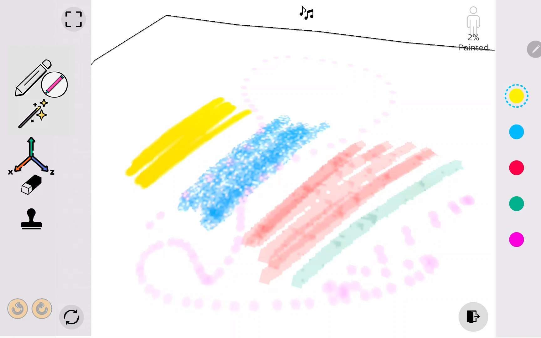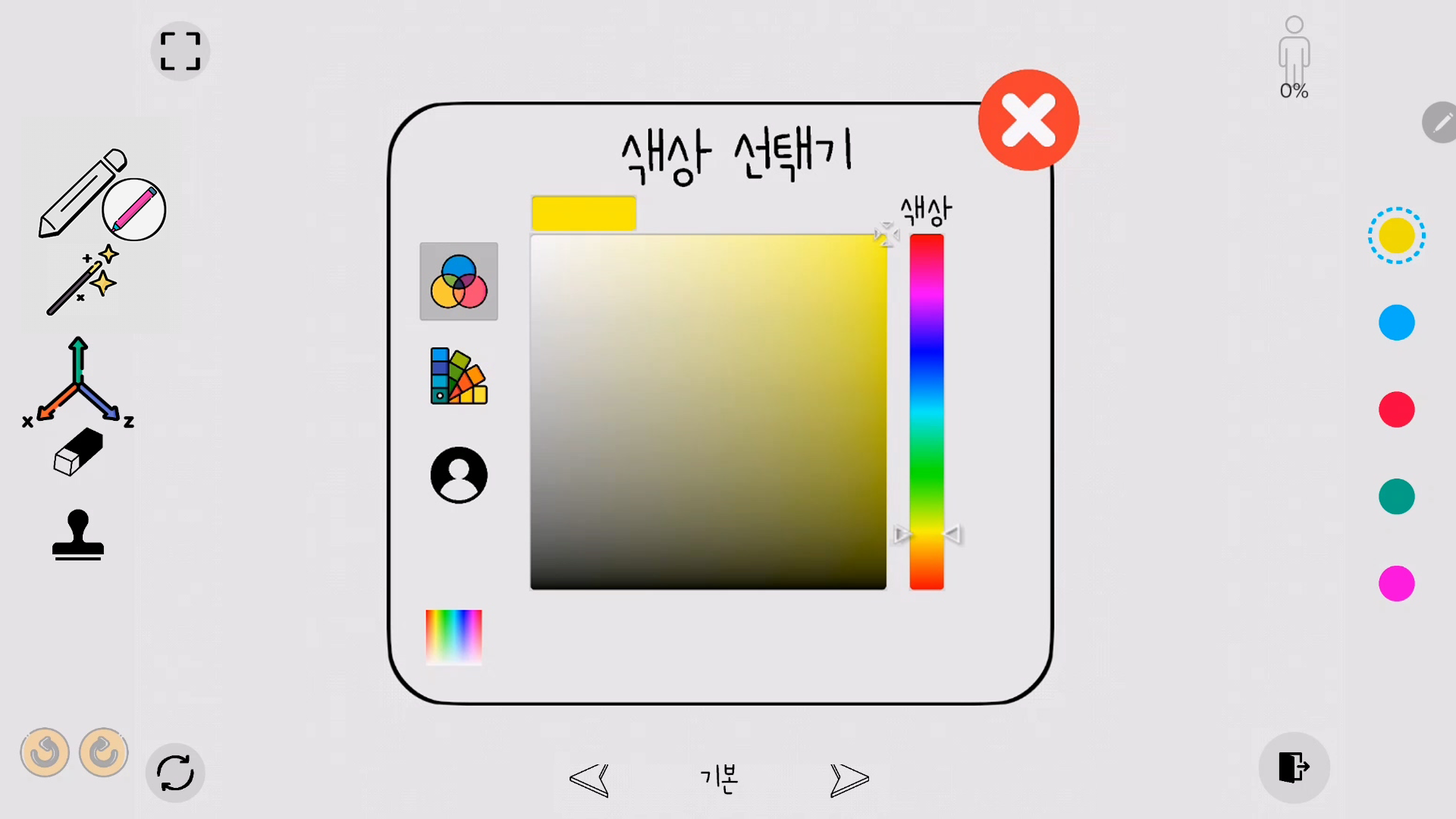 색칠씬에서 오브젝트를 색칠할수있는 다양한 색칠 도구가 제공됩니다. 오른쪽에는 자주 사용하는 다섯개의 색이 있습니다. 마치 화가가 팔레트에 여러가지 물감을 준비하듯 사전 세팅한 다섯개의 색을 조합하여 자유롭게 색칠하세요.
