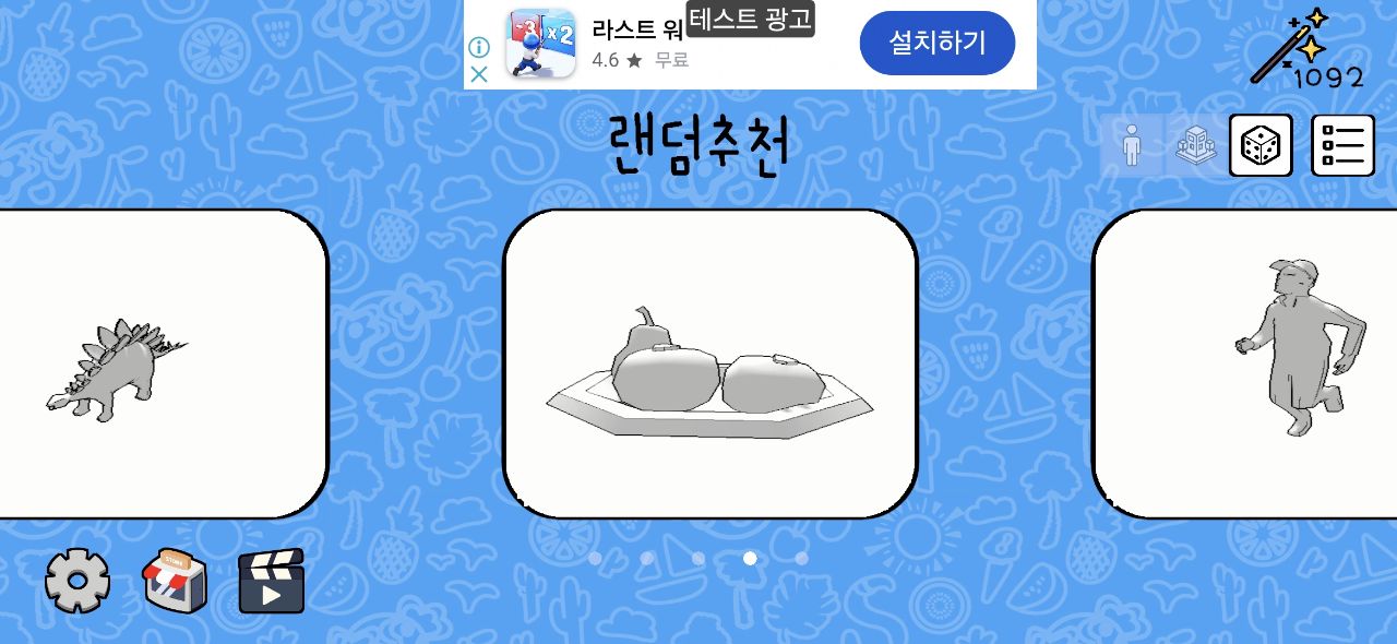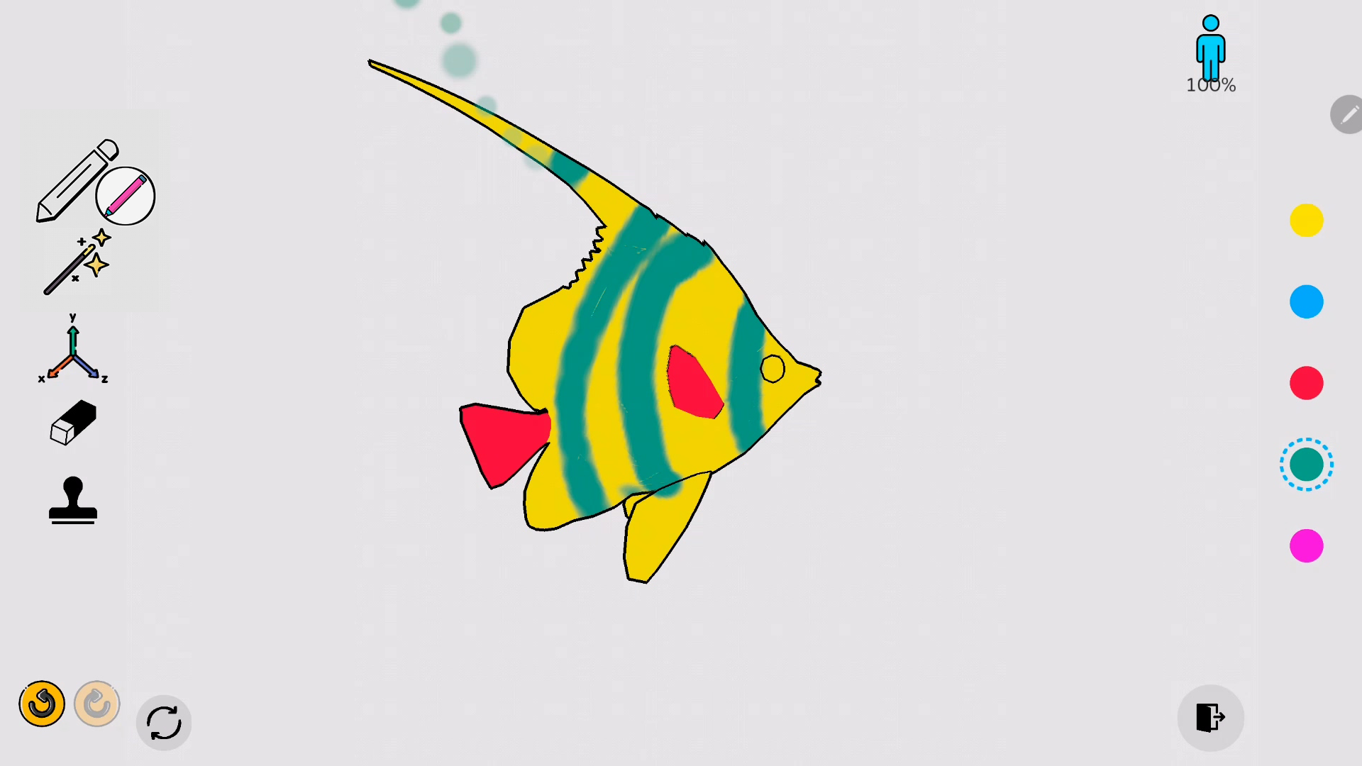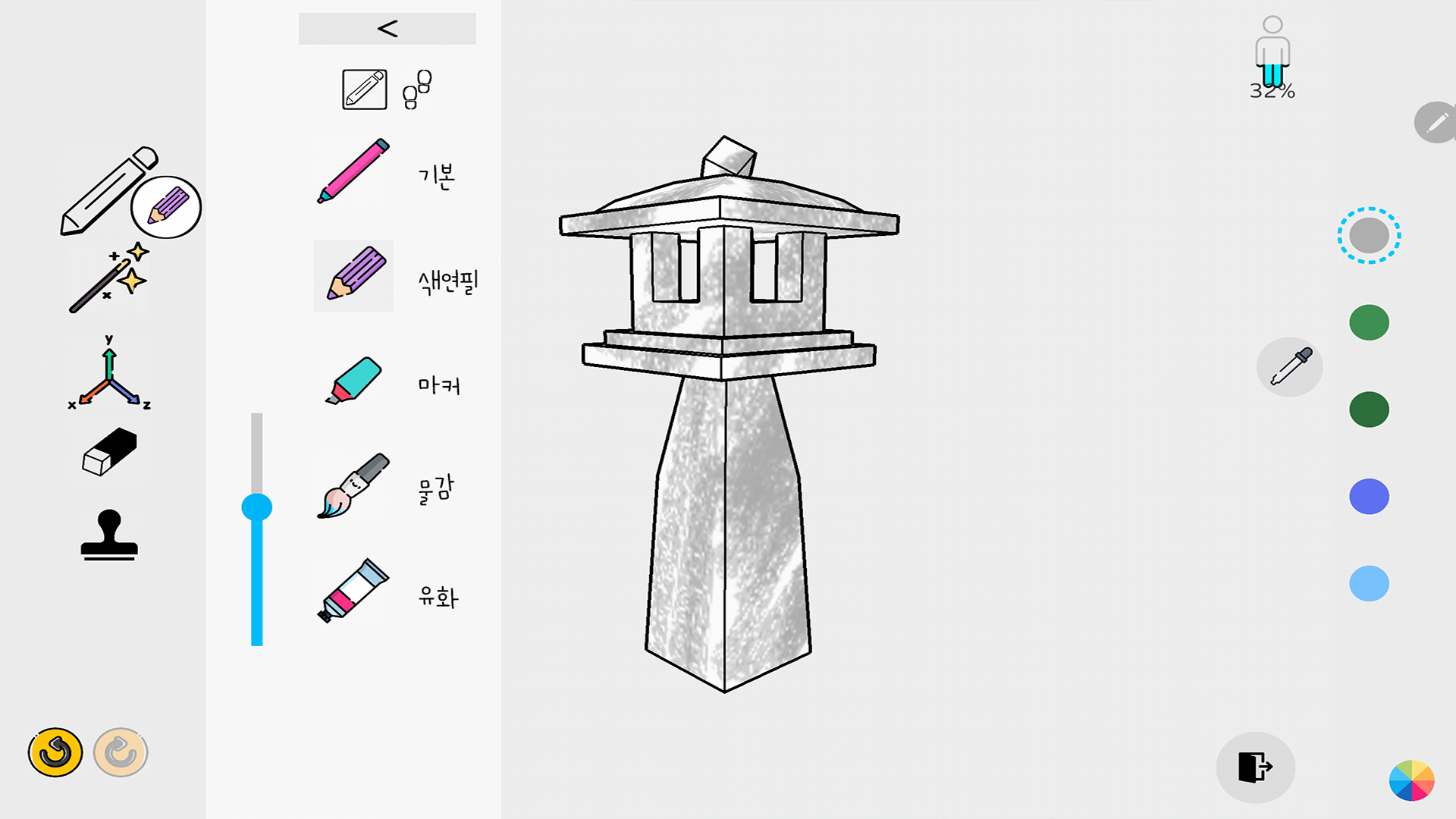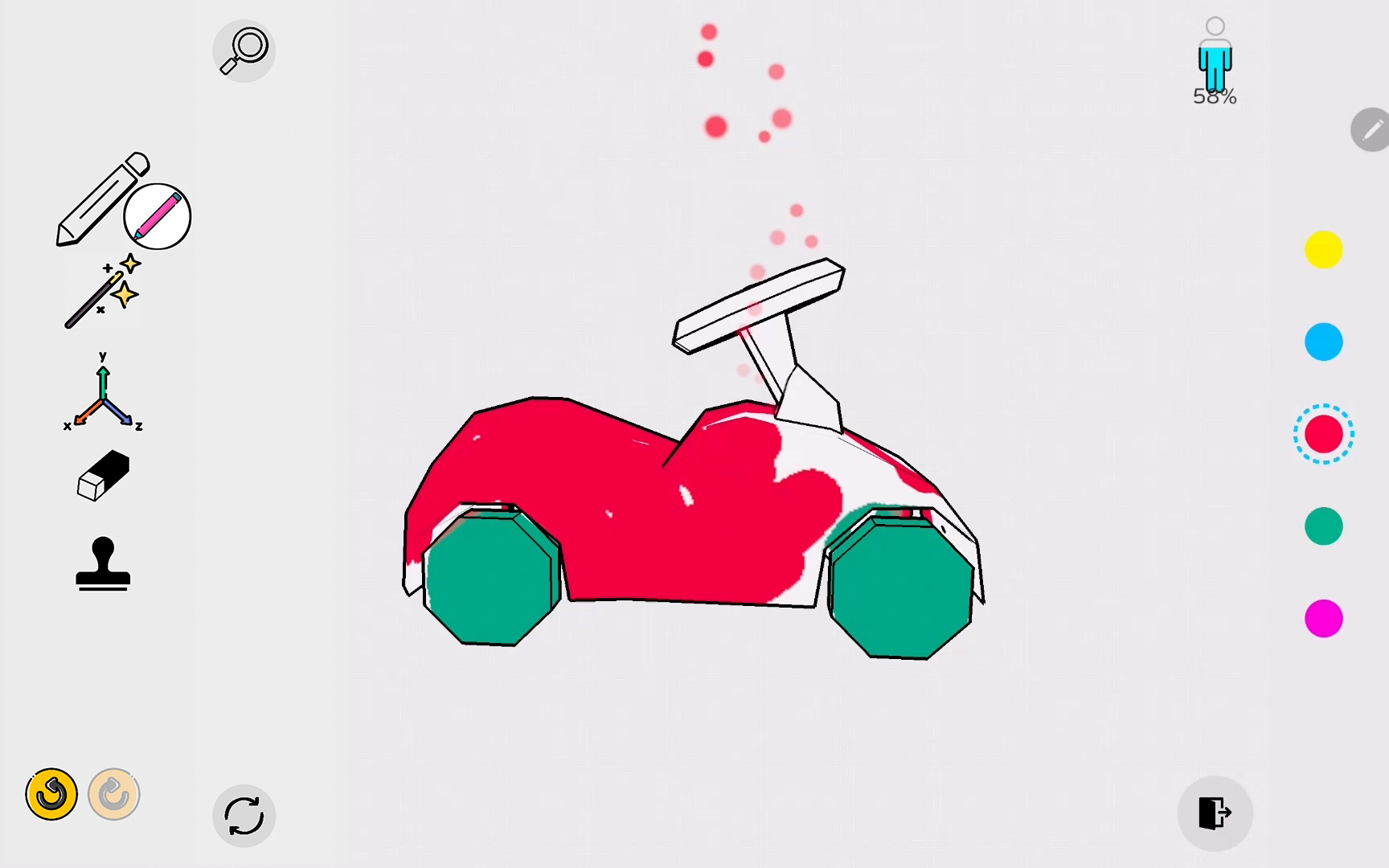 색칠씬에서 오브젝트를 색칠할수있는 다양한 색칠 도구가 제공됩니다. 오른쪽에는 자주 사용하는 다섯개의 색이 있습니다. 마치 화가가 팔레트에 여러가지 물감을 준비하듯 사전 세팅한 다섯개의 색을 조합하여 자유롭게 색칠하세요.