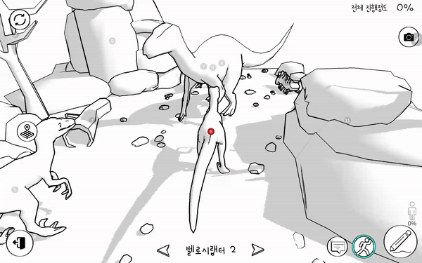 게임을 시작하면 월드에 이야기와 애니메이션( 사람, 동물, 공룡의 3D 애니메이션을 플레이해보세요)을 포함하는 다양한 종류의 색칠 대상 오브젝트들이 있습니다. 숫자 아이콘 또는 화살표 버튼을 터치해서 오브젝트를 선택하고 카메라를 컨트롤하여 월드를 둘러보세요. 색칠을 원하는 오브젝트를 선택하고 페인트 버튼을 터치하면 색칠 씬으로 이동합니다.