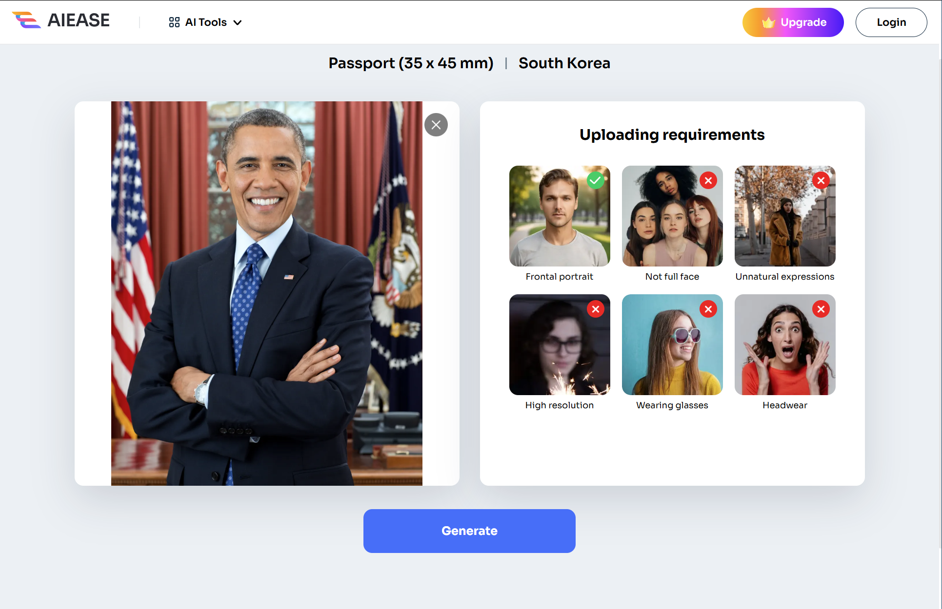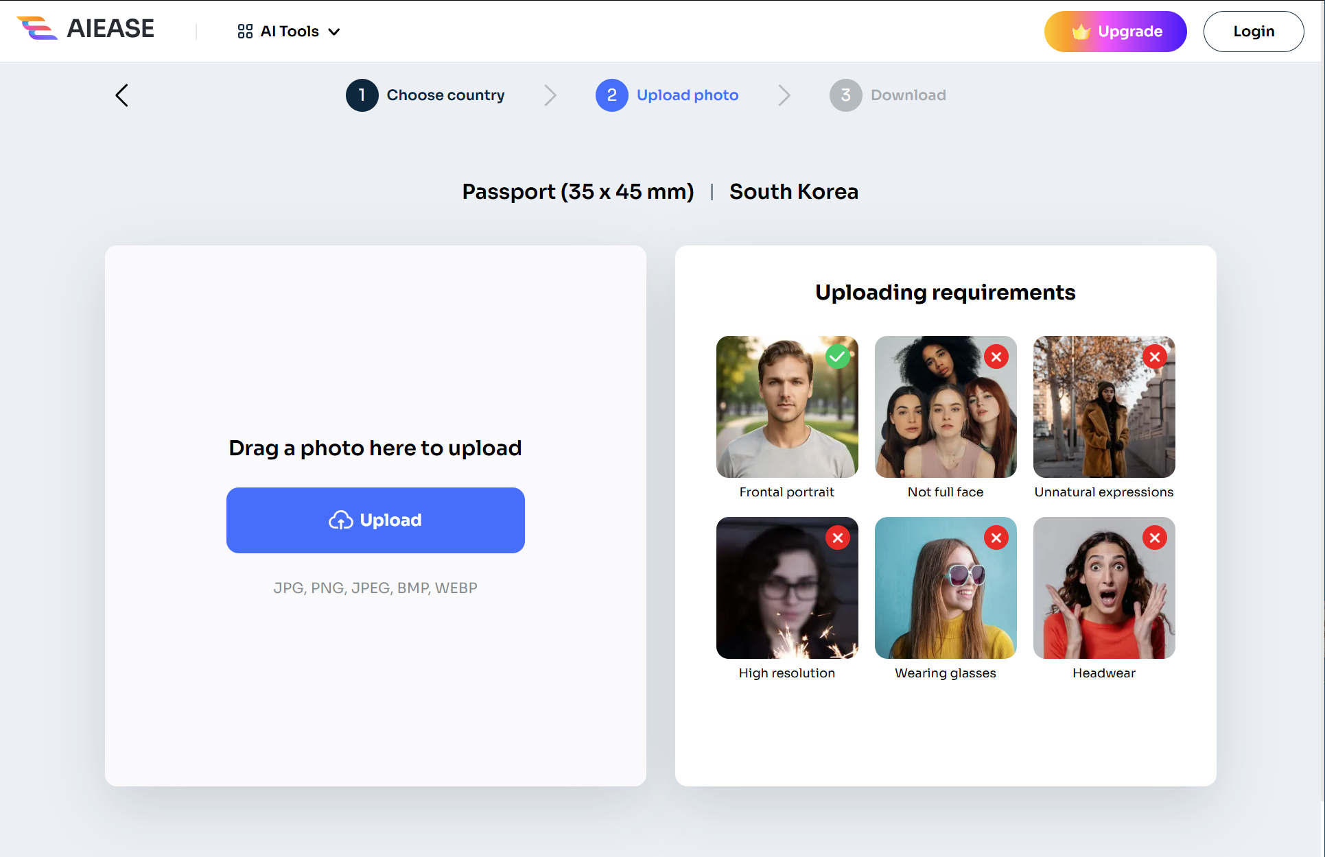Free Passport Photo Maker(AIEASE) - 무료 AI 여권 사진 만들기 사이트