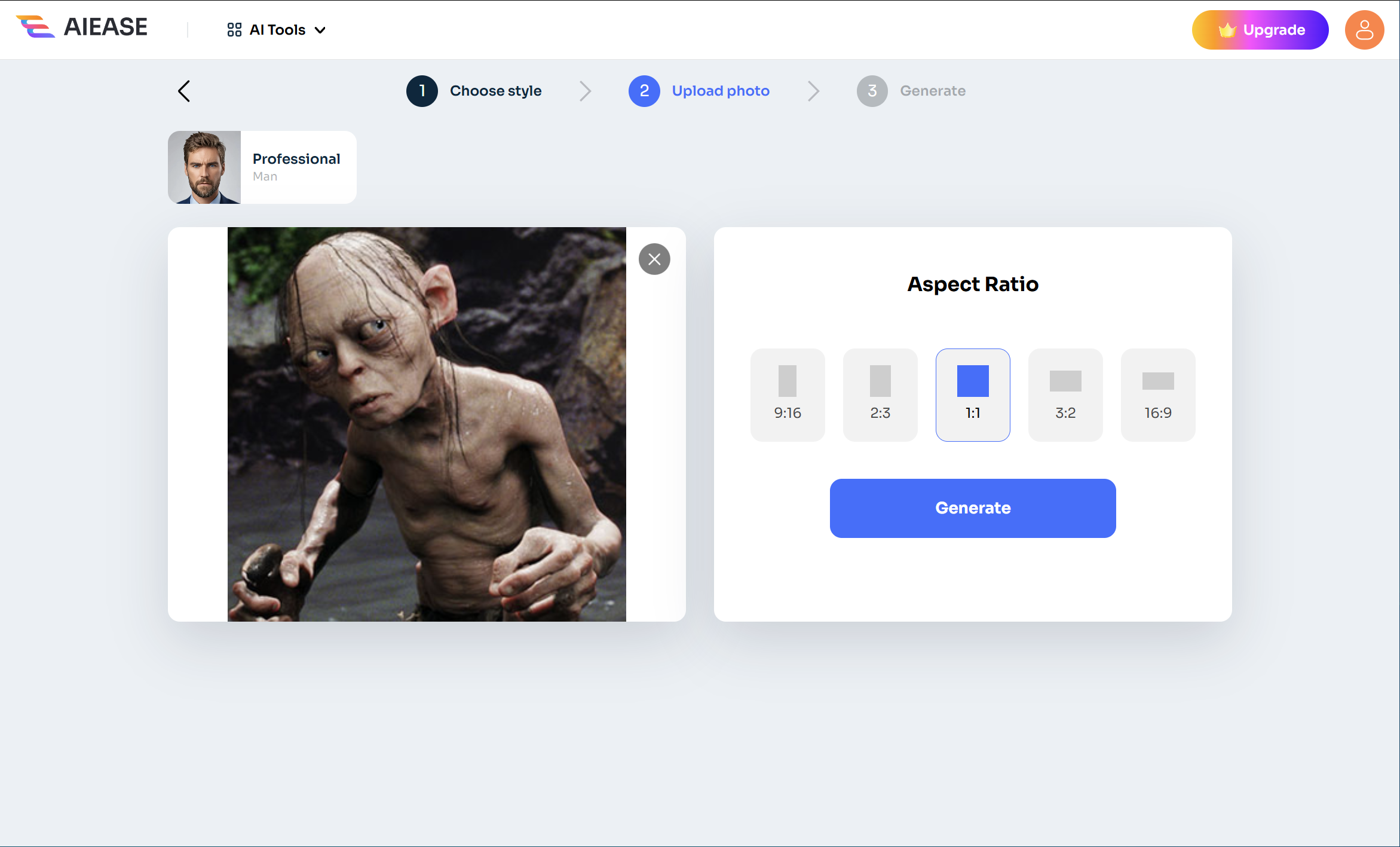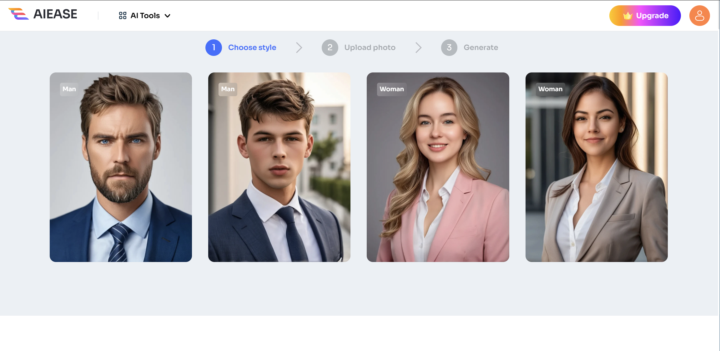 Choose your preferred headshot style, upload your frontal portrait, and let AI Ease transform it into an amazing AI headshot for free. Apply it to your business, social media, and gaming profile!