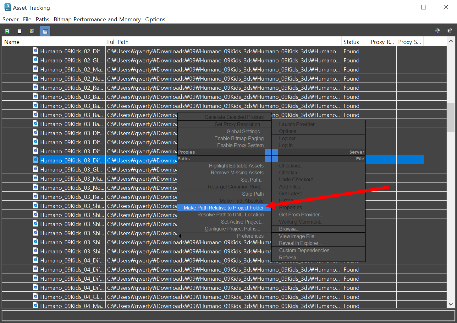 3)에셋의 경로를 재설정하려면 목록에서 에셋을 선택하고 마우스 우클릭 메뉴에서 Make Path Relative to Project Folder를 선택합니다.