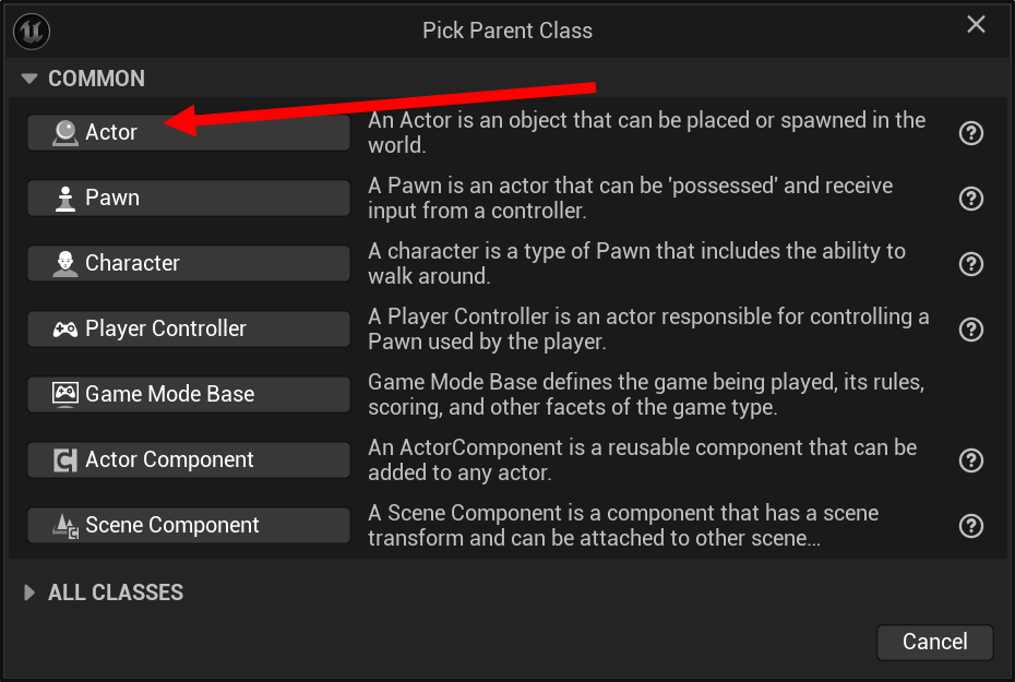 2)pick parent class에서 액터(actor)를 선택합니다.