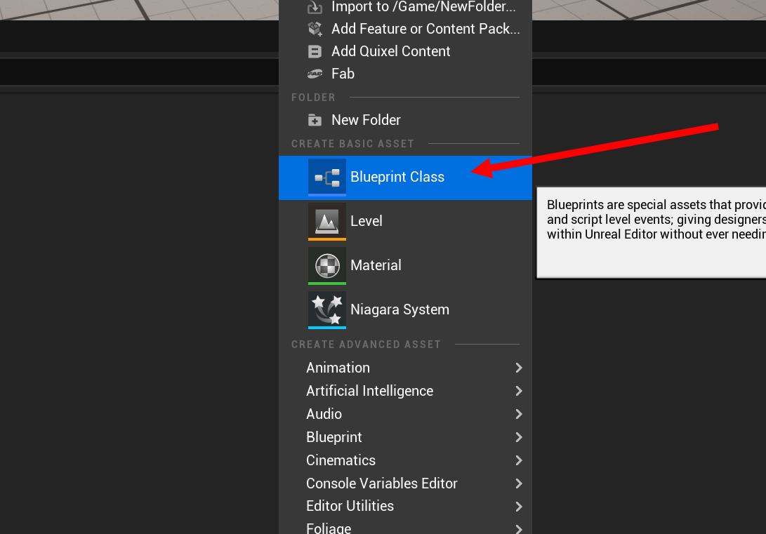 1)콘텐츠 브라우저에서 새로운 블루프린트 클래스를 생성합니다.