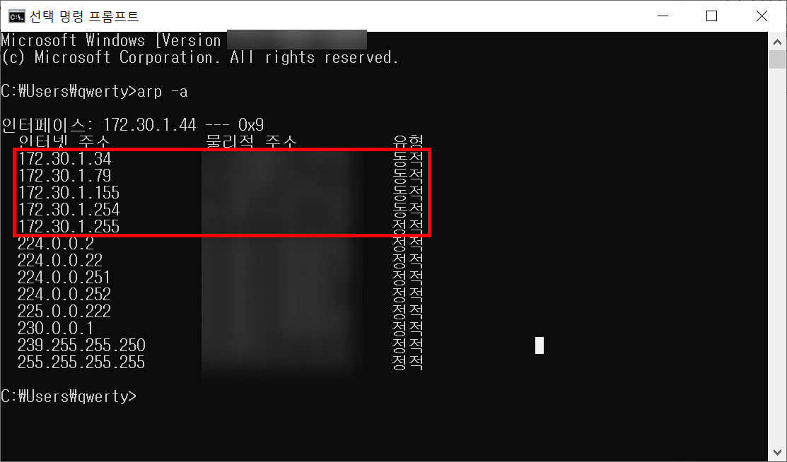 명령프롬프트에서 arp -a를 입력하여 연결된 모든 장치 및 아이피주소를 확인합니다. 또는 공유기 관리자페이지에서 공유기 및 허브에 연결된 모든 유무선 단말정보를 확인할수있습니다.
