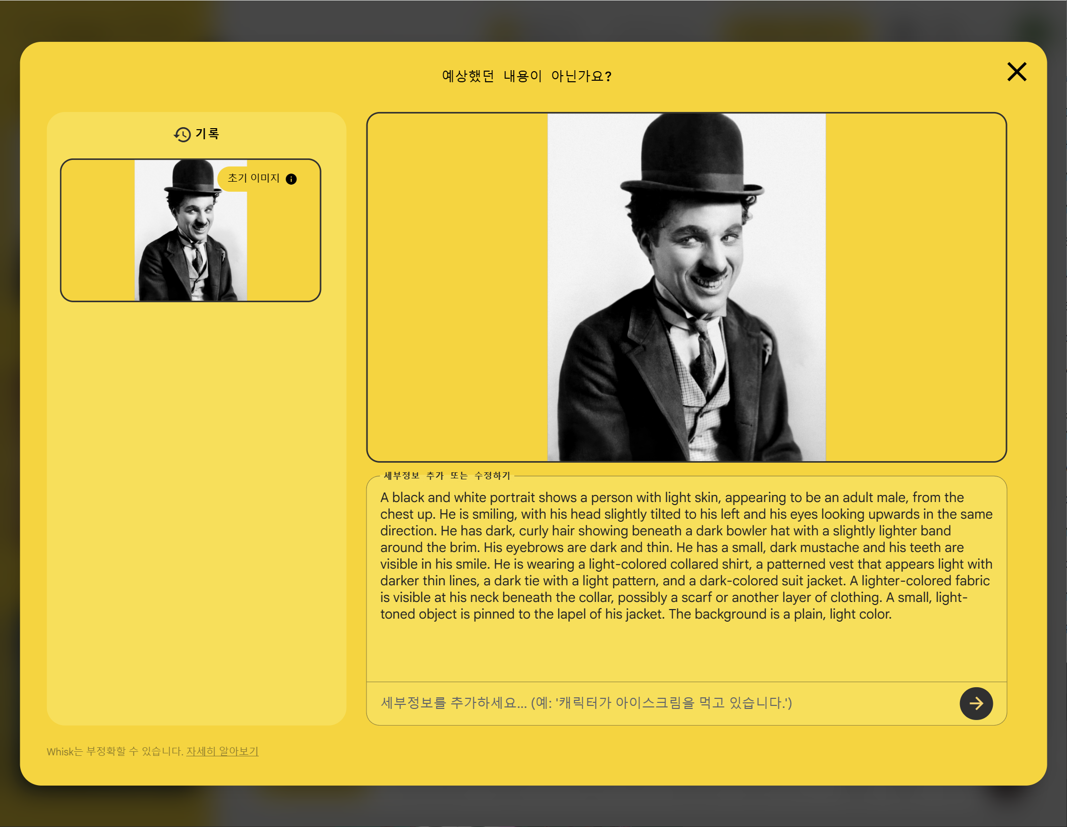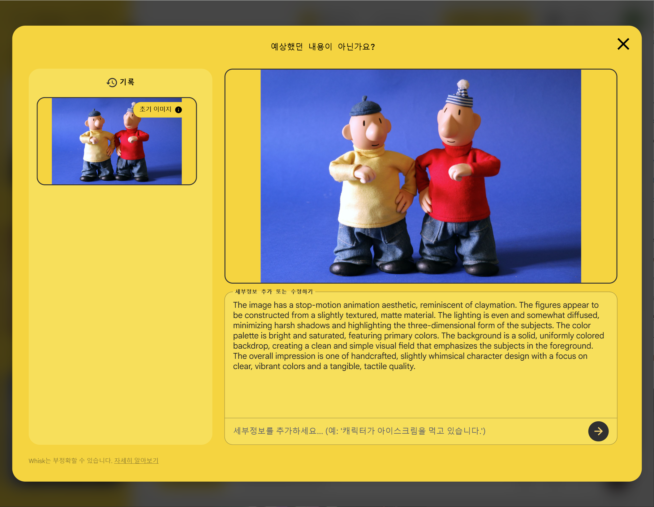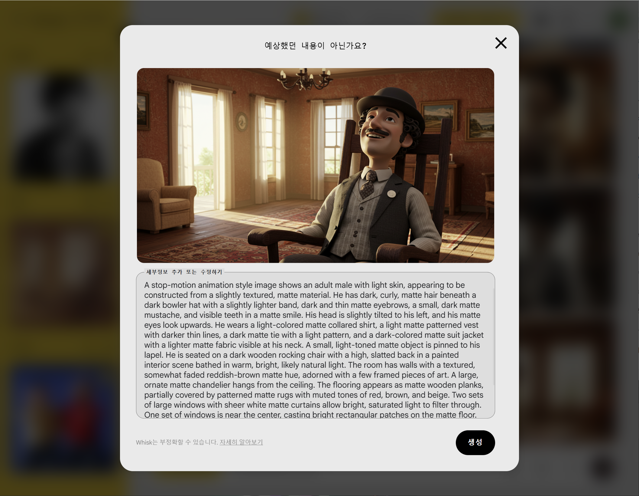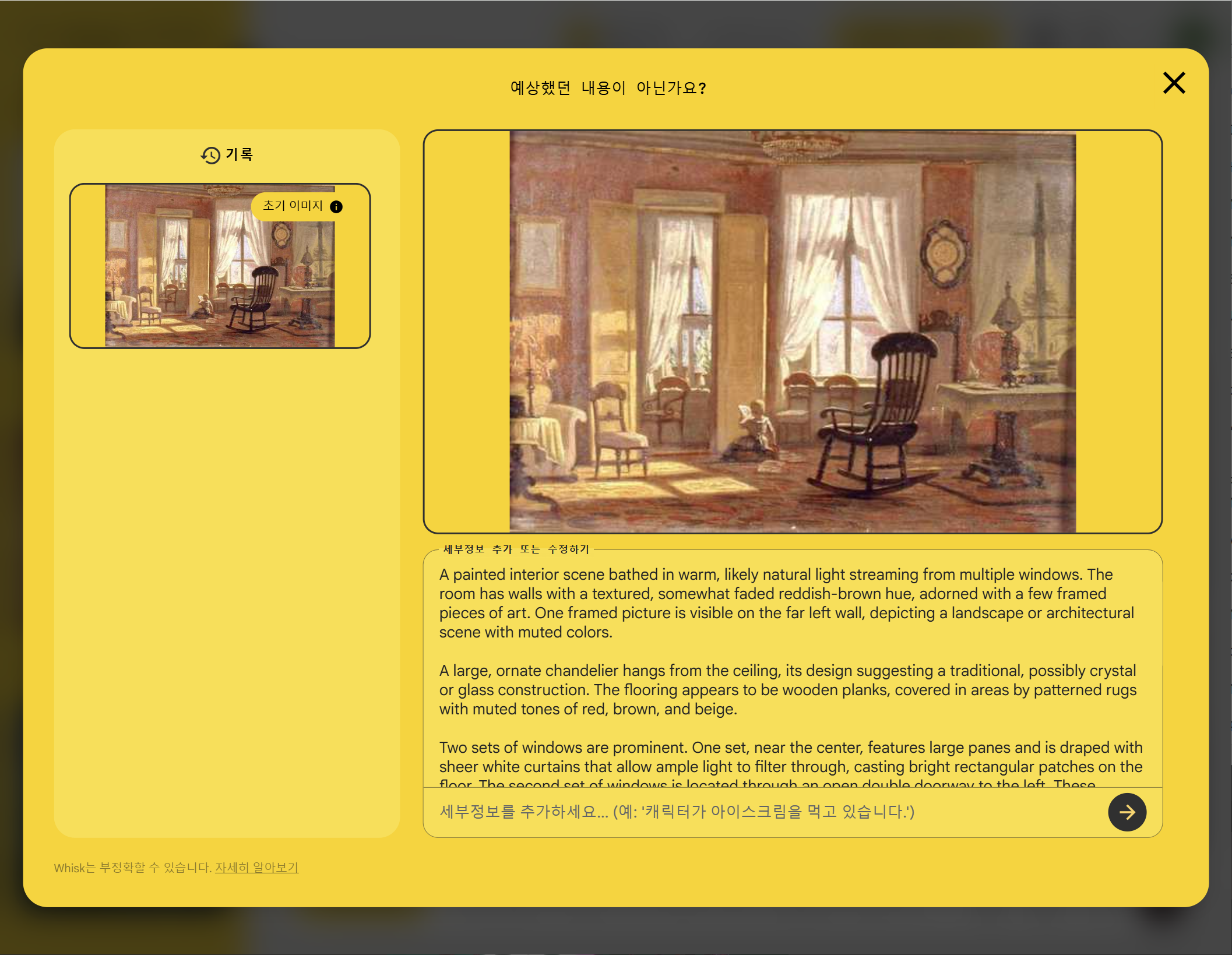 구글의 Gemini 모델이 해당 이미지에 대하여 자동으로 작성한 텍스트 설명 (I2T, Image to text) 을 확인할수있습니다. 텍스트 설명은 아이디어를 리믹스하고 결과적으로 이미지 생성 모델인 Imagen 3에 의해 최종 프롬프트를 작성하고 이미지를 생성하는데 사용됩니다.