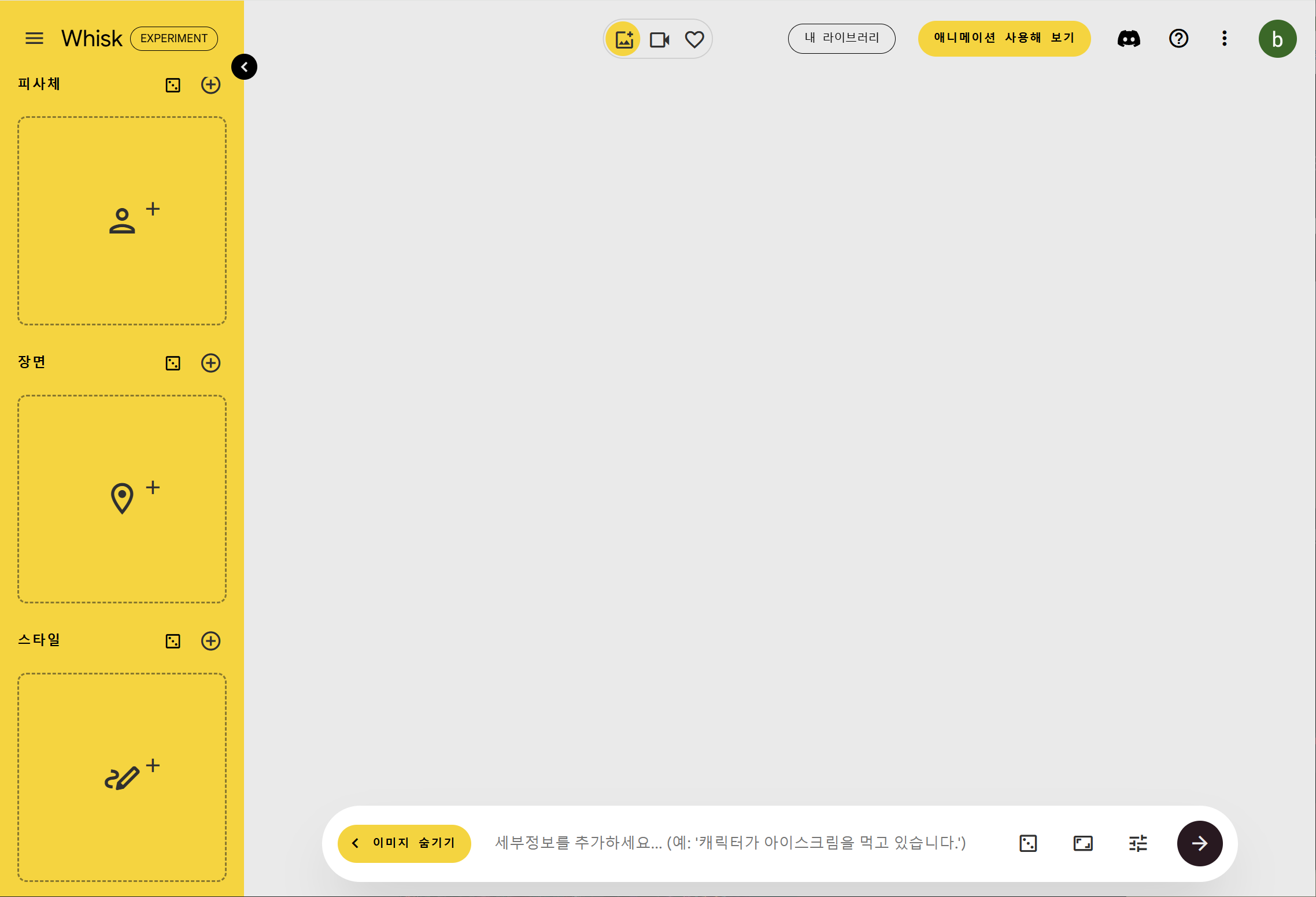 Whisk AI를 사용하면 피사체, 장면, 스타일의 세가지 참고 이미지를 사용하여 복잡한 프롬프트없이 쉽고 재미있는 방법으로 이미지를 생성할수있습니다. 빠르게 아이디어를 시도해보거나 결과물을 반복 맟 조정하며 시각적으로 리믹스할수있습니다. 구글 계정으로 로그인하면 무료로 이용가능합니다.