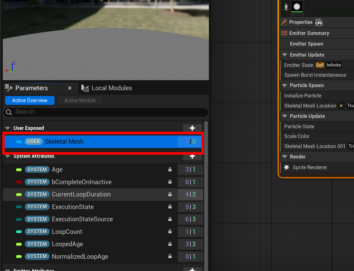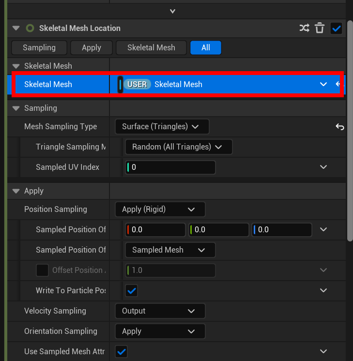 4)추가한 사용자 Skeletal Mesh 파라미터를 skeletal mesh location 모듈의 Skeletal Mesh에 할당합니다.