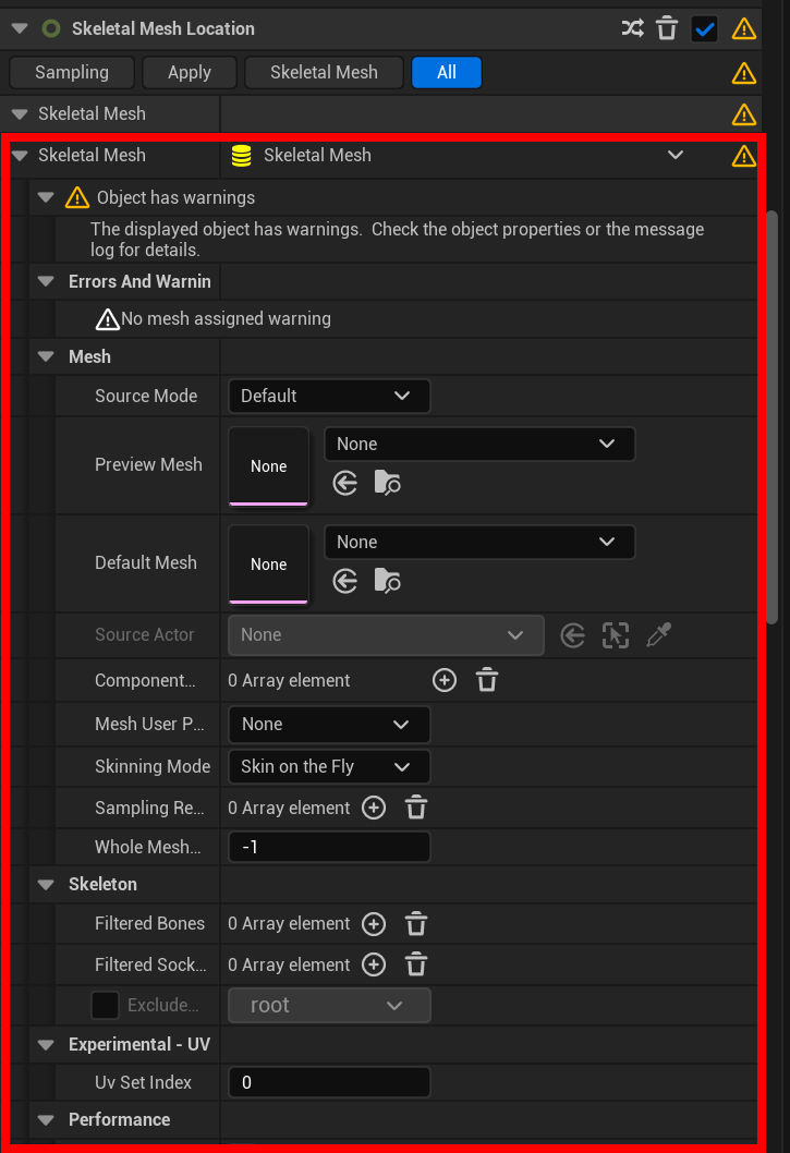 2)현재 skeletal mesh location의 메시가 할당되지않은것을 확인할수있습니다.