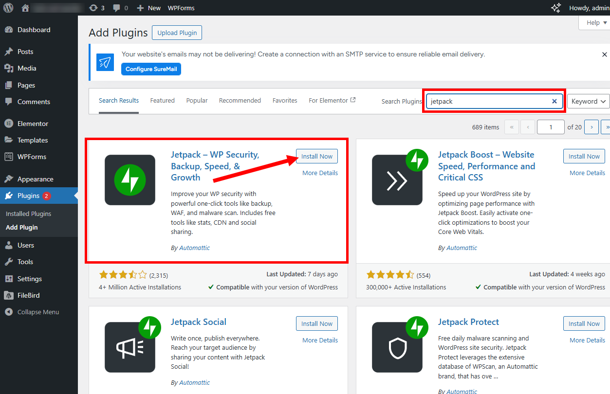 1)워드프레스 사이트 관리자페이지의 좌측에서 플러그인(plugins) 메뉴로 이동하고 jetpack 플러그인을 검색 및 설치합니다(install now)