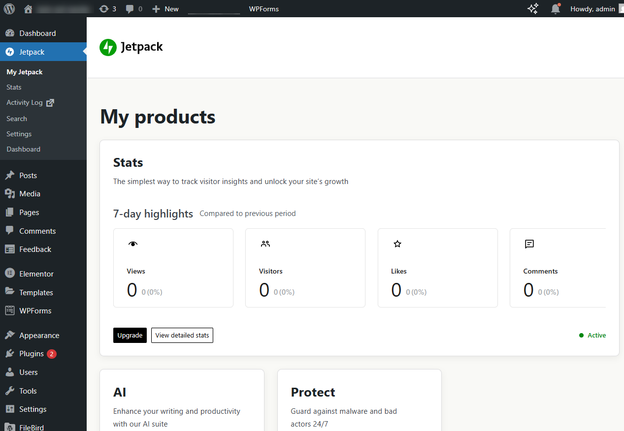 jetpack은 워드프레스의 모회사인 Automattic에서 개발한 공식 플러그인으로 워드프레스닷컴 계정과 연동하여 사이트 보안, 성능, 분석, 통계, 마케팅등을 위한 유용한 기능을 무료로 제공합니다.